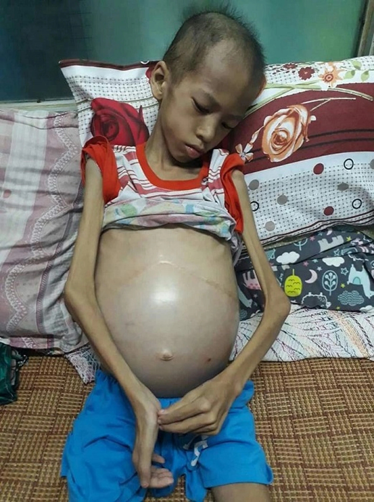 Baby Tran Van Kiem born in 2010. I remember that I was born healthy like many other children, but everything changed when I just finished grade 1 (in 2017) and often had abdominal pain. Then the baby’s belly gradually swelled up like a drum, his body ached, making him cry all day.
