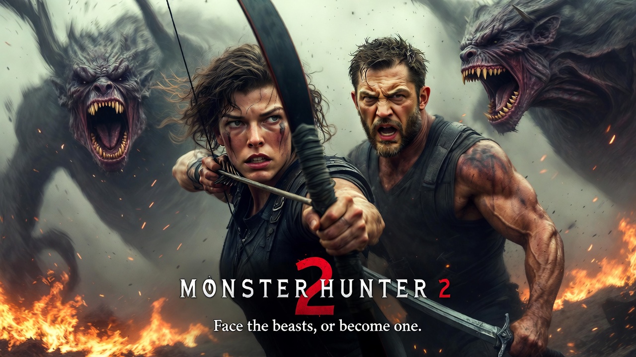 Milla Jovovich’s hunter, bow drawn and eyes unwavering, confronts creatures of unimaginable size and terror, while Tom Hardy’s warrior grips his sword, muscles tensed, ready to face the wrath of a world gone wild. Mist swirls, flames dance, and the ground trembles beneath every monstrous step.