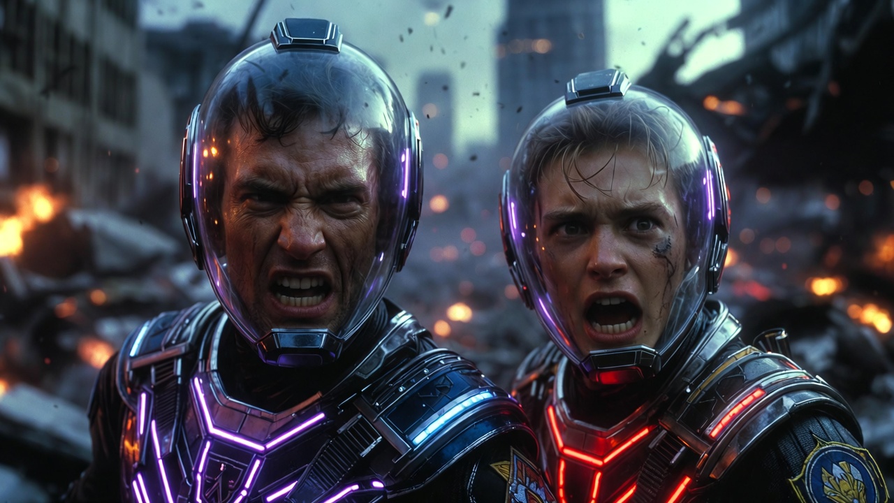 Their eyes meet the storm of destruction, reflecting anger, hope, and the desperate longing to protect everything they hold dear. Neon glimmers from their suits cut through the darkness, illuminating courage that refuses to yield.