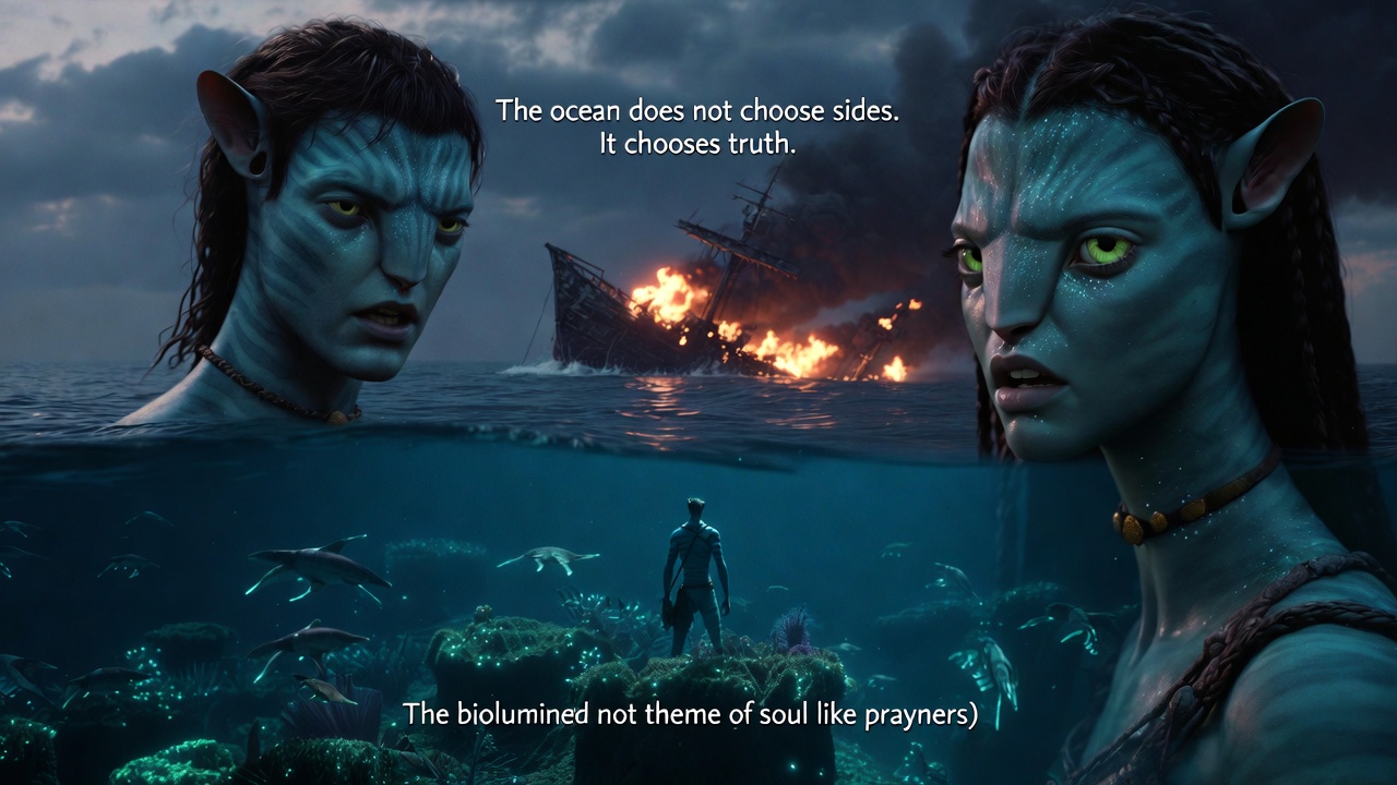 Bioluminescent reefs glow like prayers in the dark, while burning wreckage sinks into sacred waters. Neytiri stands unwavering, her heart torn between rage and devotion, protecting not only her family but the soul of Pandora itself.