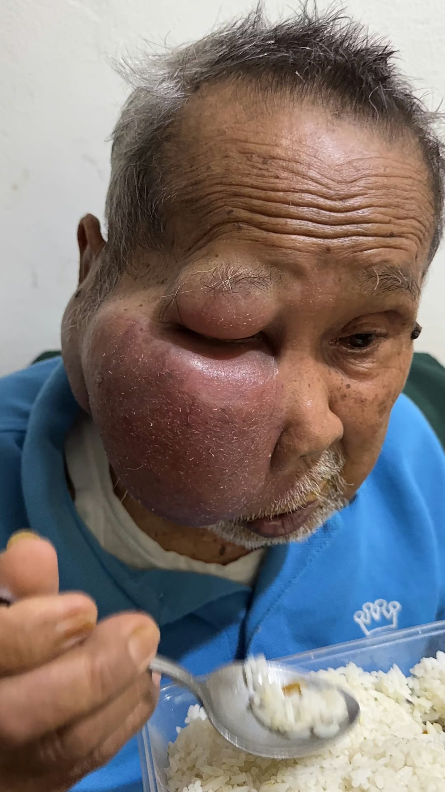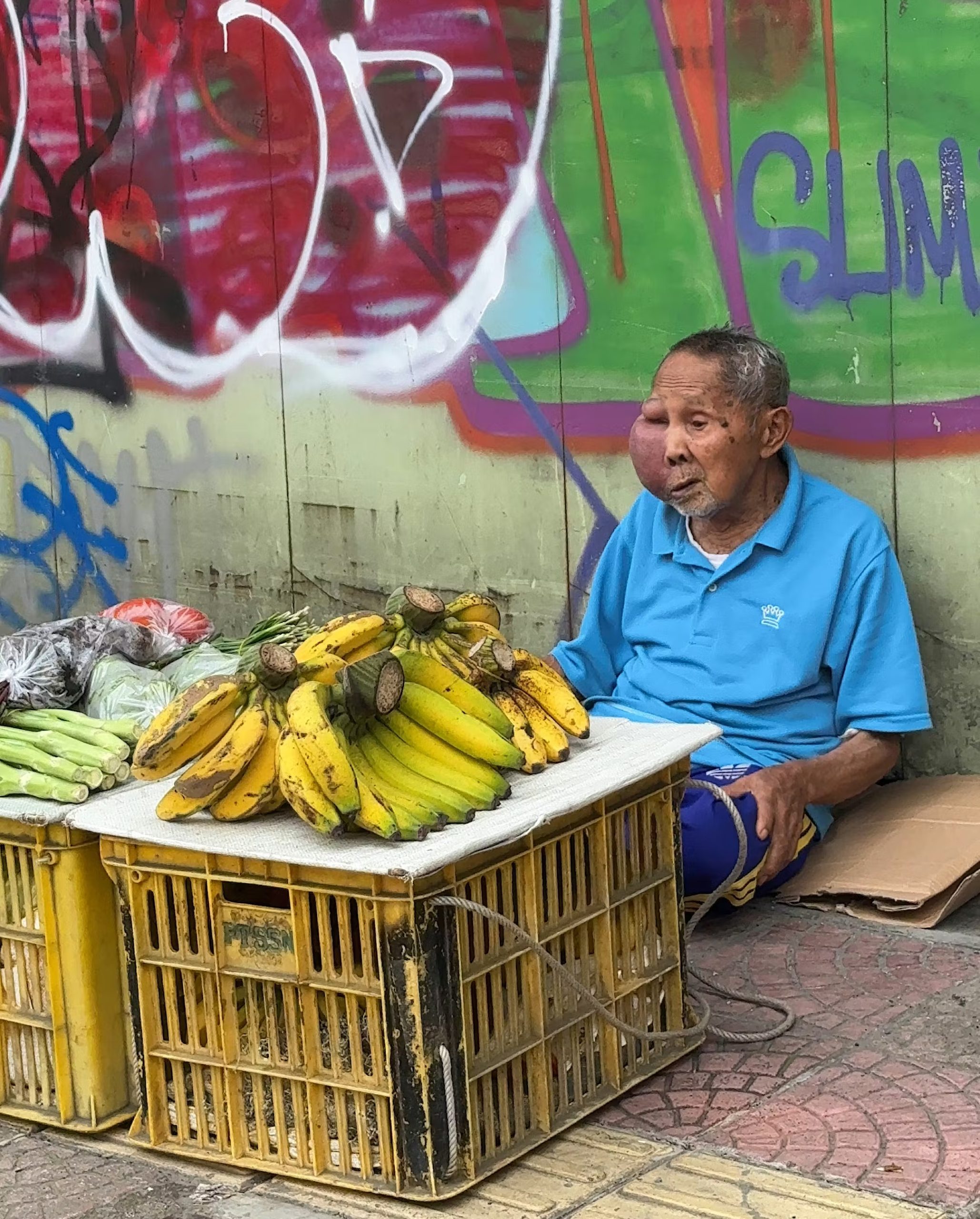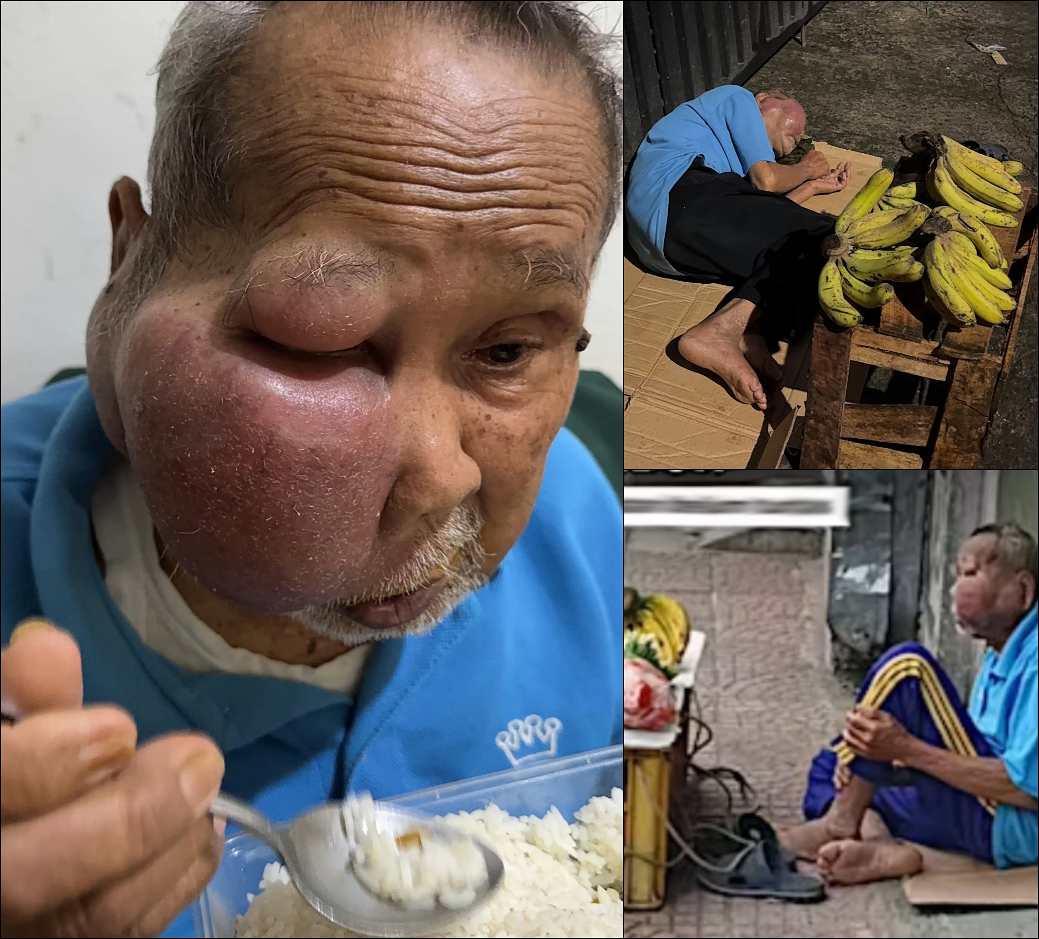 Pak Daman, 83, is no longer in the physical condition he once had. His face has become severely swollen, his eyesight is increasingly blurred, his hearing has weakened, and every step he takes is slow and painful. Yet despite his deteriorating health, he continues to work every day, sitting by the roadside to sell small amounts of produce in order to survive.