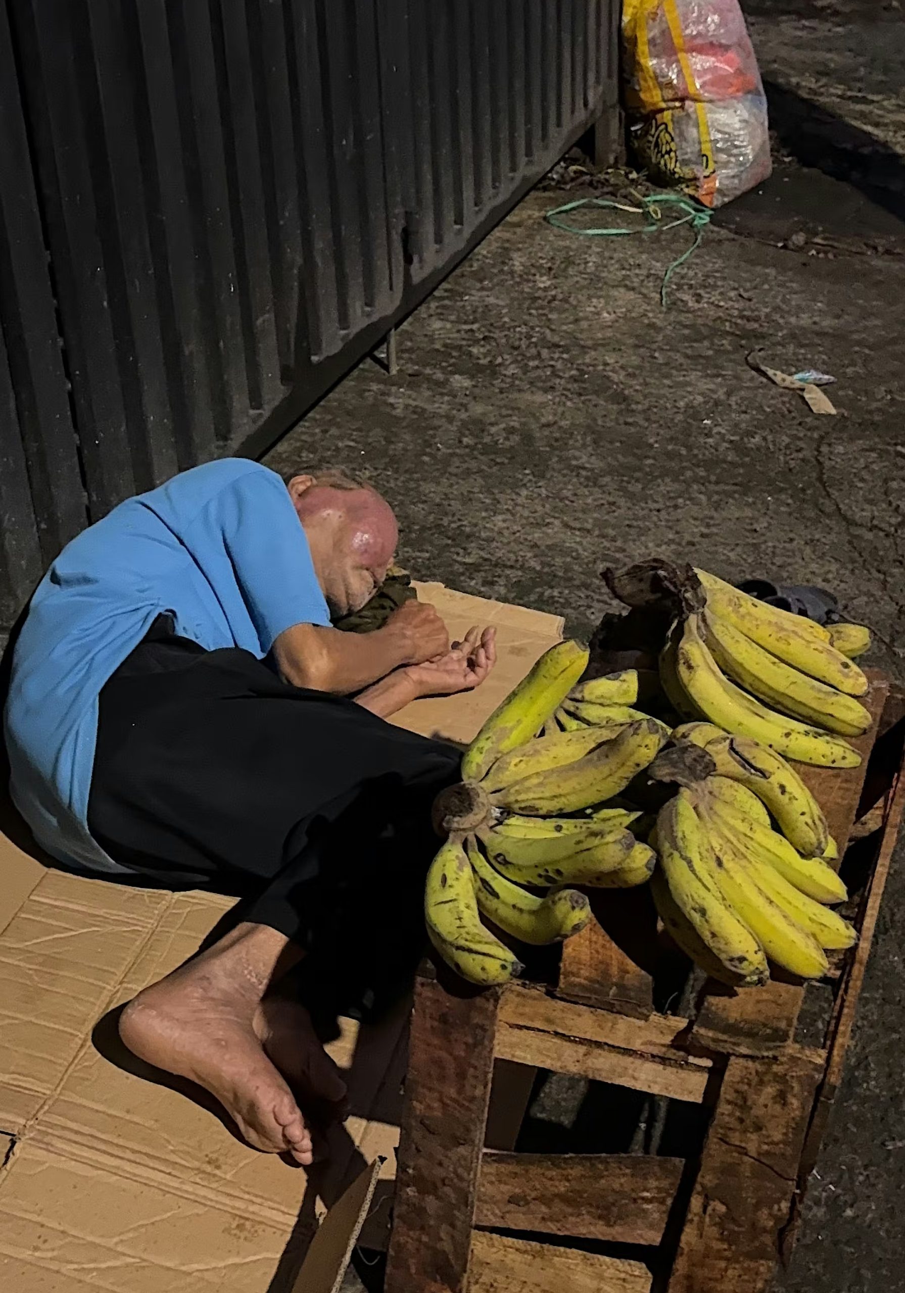 At an age when most people would be resting at home, Pak Daman instead leaves his house daily with bananas, cassava, and vegetables to sell. With unsteady steps, he walks to the roadside early in the morning and remains there until late at night. His hope is simple: to sell enough goods to collect small amounts of money that could eventually be used for treatment.