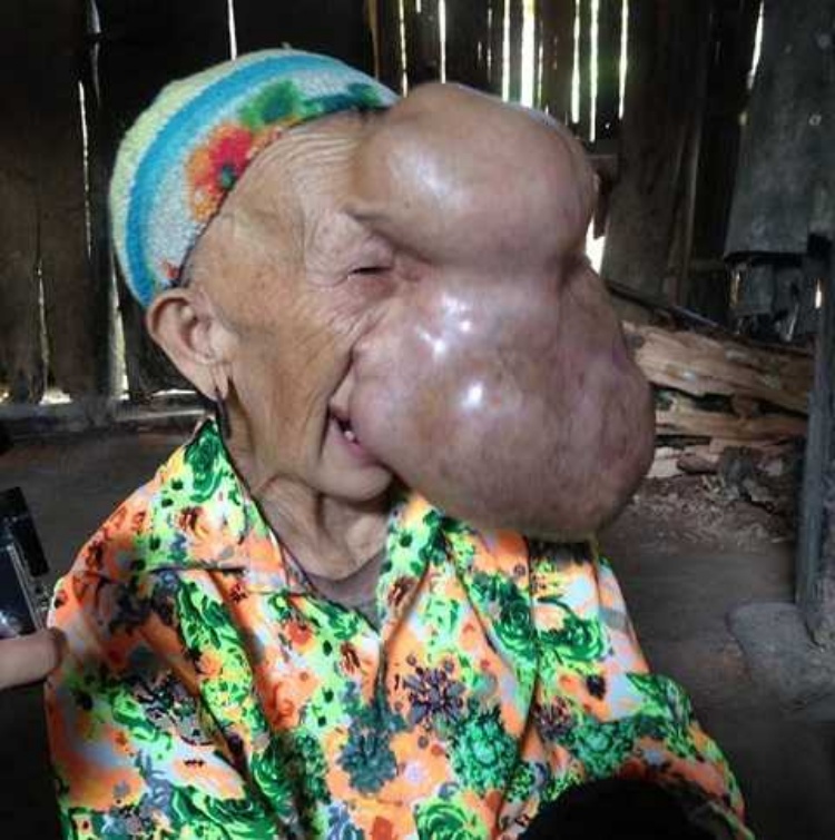 Mrs. Chai’s story began 20 years ago, when she was 40. At that time, a small pimple—no larger than a fingertip—appeared on her face. Coming from a poor ethnic Dao family, she could not afford medical care. Believing it to be a harmless boil, she relied on traditional remedies, applying forest leaves in hopes it would heal. Instead, the growth continued to enlarge, year after year, eventually disfiguring her face.