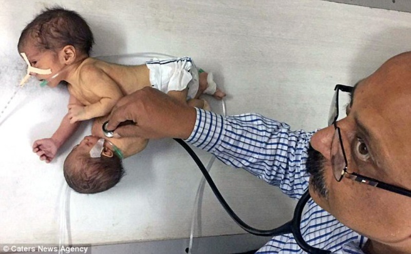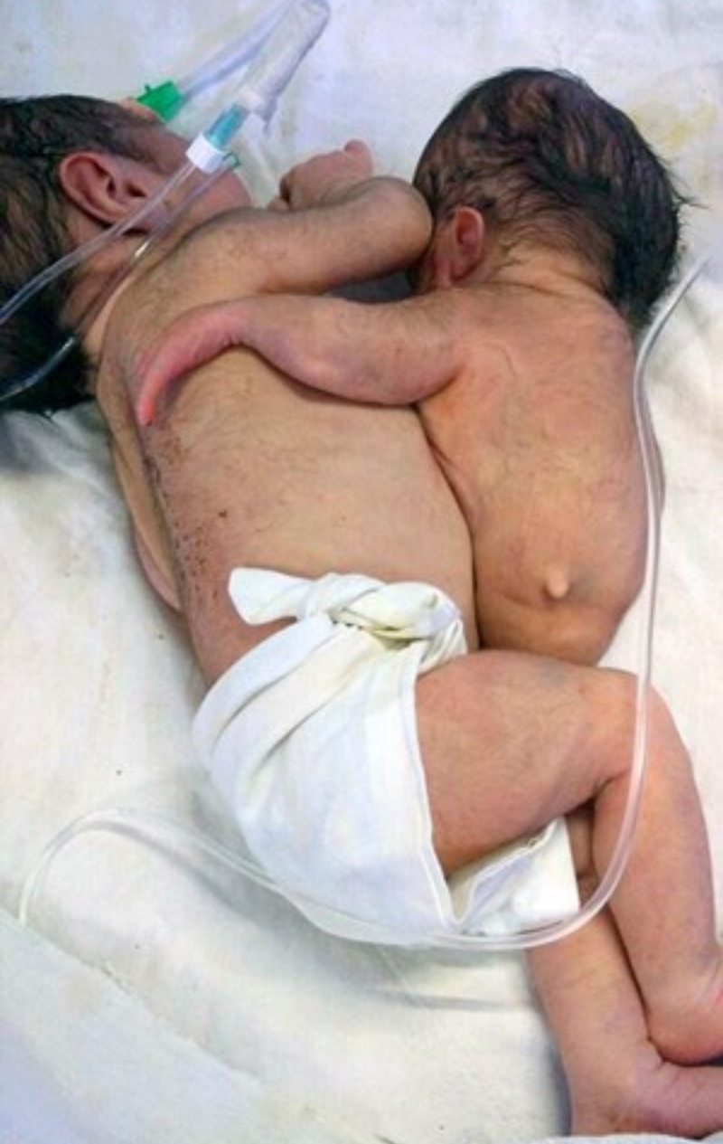 A newborn boy had his head and arms fused together and dangling from his chest by his parasitic twin. Both twins shared a liver and blood vessels in their chests, but fortunately, their hearts and lungs were separate.