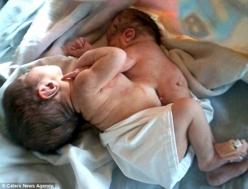 This is a rare case of parasitic twins. Parasitic twins are caused by delayed separation of the embryos during fertilization, resulting in one fetus overshadowing the other. Unlike normal conjoined twins, parasitic twins may not develop fully or may share some organs with the healthier fetus.