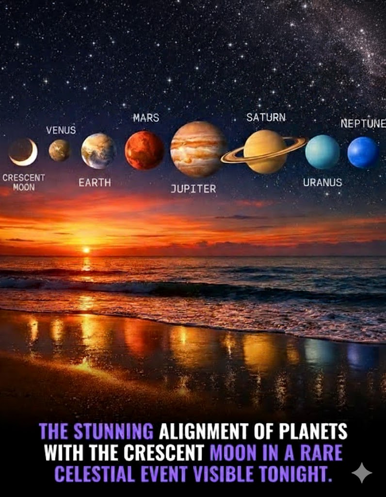 The crescent moon will act as a natural marker, helping observers locate the planetary chain and adding a soft, poetic touch to the scene. While the planets are not physically lined up in space, their shared position along the solar system’s plane creates a rare and visually stunning perspective from Earth.
