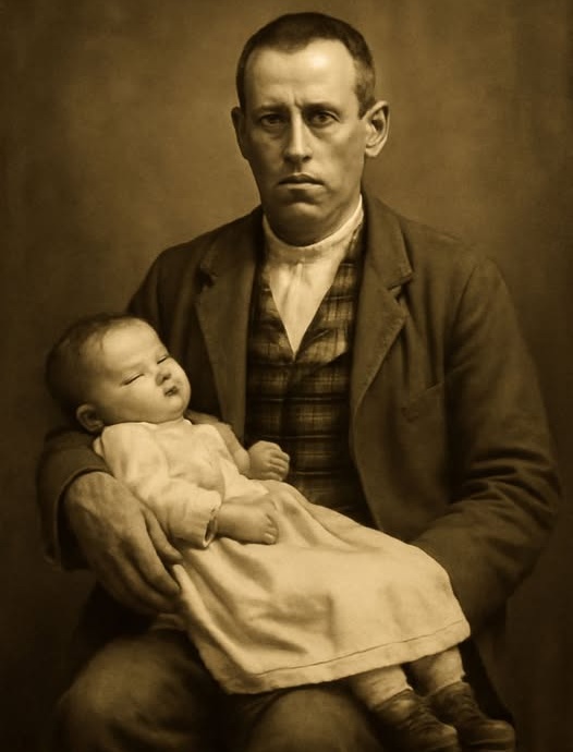In the winter of 1891, inside a quiet studio in London, a grieving father named Edward Harrow took part in one of the most poignant moments of his life. Standing before a camera’s lens, he held the small, still form of his infant daughter, Clara — a child whose brief time on earth had already passed. The photograph that followed would become more than a portrait; it would stand as a lasting expression of love, loss, and remembrance.