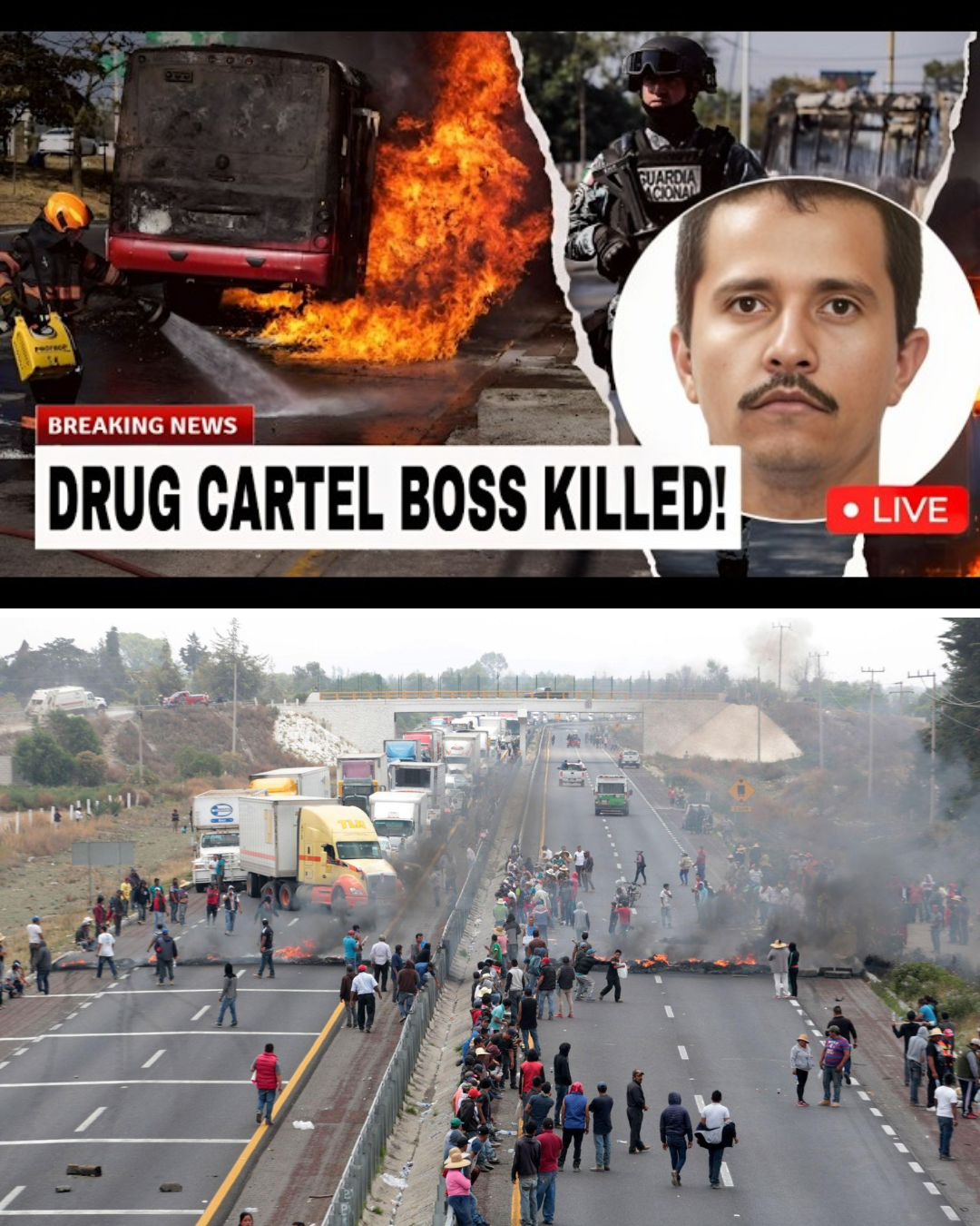 Witness accounts—unverified yet widely shared—claim that coordinated retaliation erupted across multiple states within hours of the alleged assassination. Convoys of armed cartel operatives reportedly ignited transport trucks, blocked major highways, and set vehicles ablaze in urban centers. Videos circulating online show thick black smoke rising above highways and masked gunmen firing into the night sky. Authorities have not confirmed that these incidents are connected to any specific event, but the imagery has fueled widespread panic.