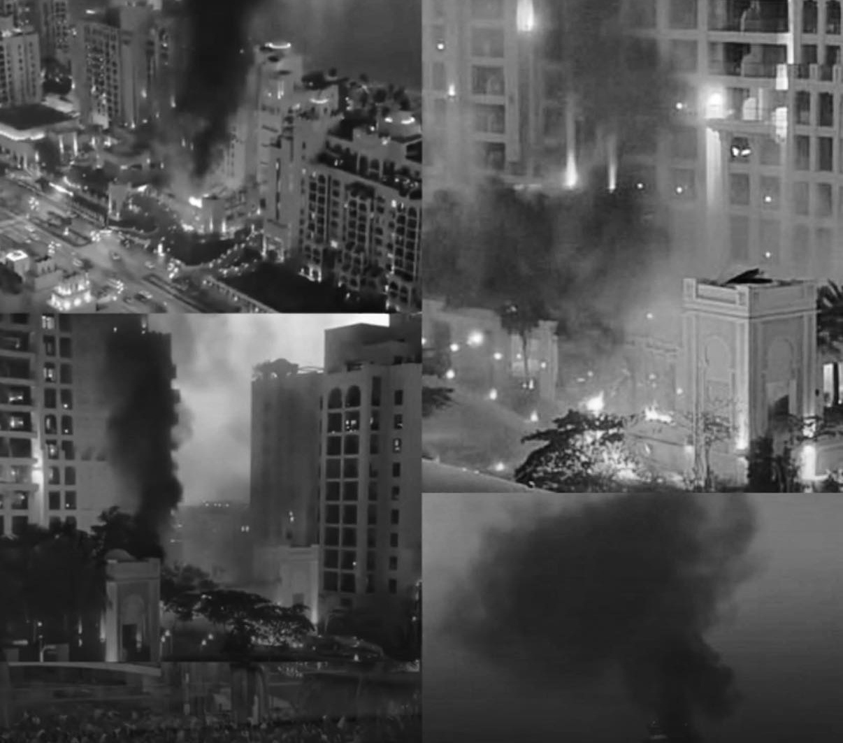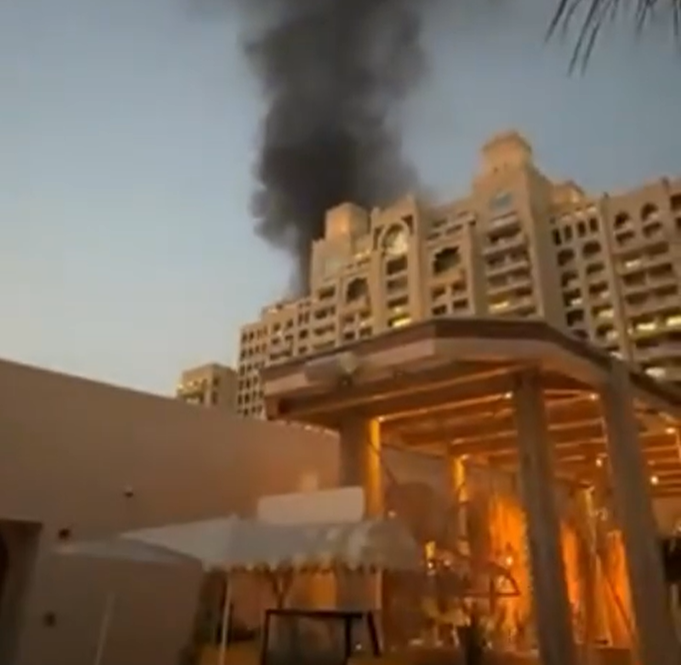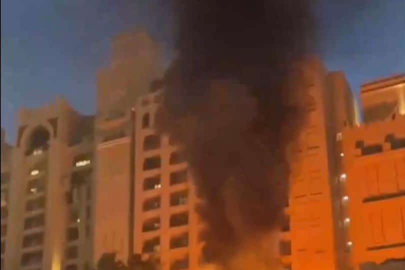 Thick plumes of black smoke were seen across the skyline in Dubai after a popular hotel caught fire following reports of an aerial incident.