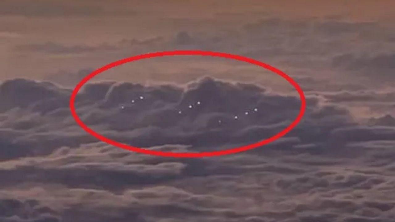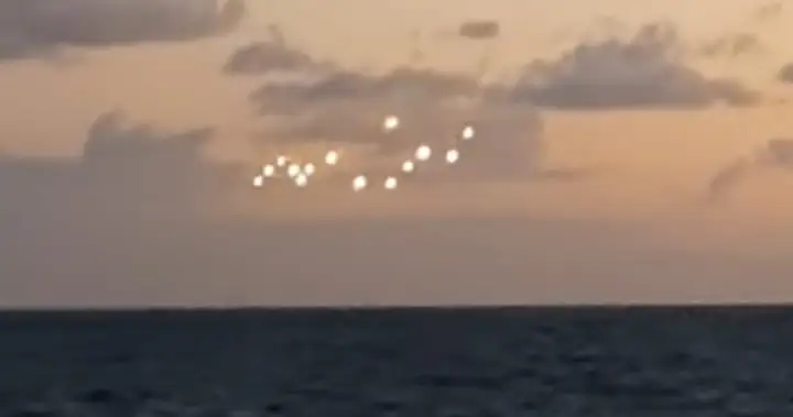The so-called “UFOs” appear as 14 pinpoints of light clustered in a rough line over the water in the distance, seemingly among the clouds.