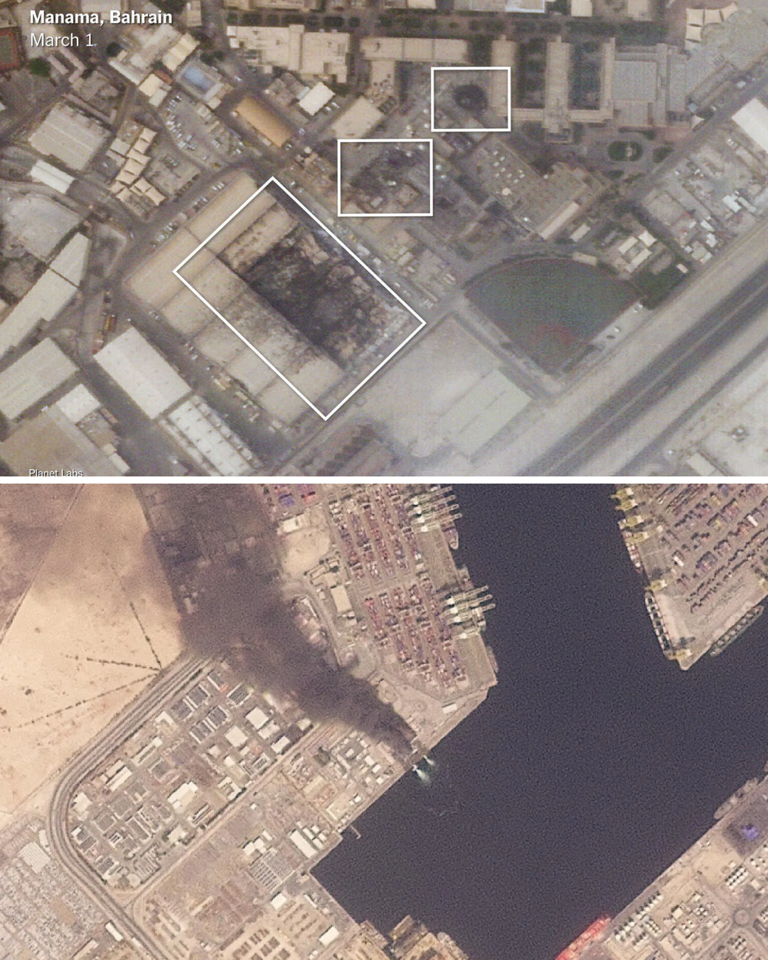 The New York Times, drawing on satellite imagery, verified videos, and statements from U.S. military officials, mapped the strikes with meticulous precision. On Saturday and Sunday, Iranian missiles and drones hit U.S. installations in Bahrain, Iraq, the UAE, and three separate sites in Kuwait. The Fifth Fleet headquarters in Manama, Bahrain — the command center of U.S. naval power across the entire Persian Gulf — had several buildings destroyed. Satellite imagery confirmed that two satellite communications terminals were obliterated, alongside extensive damage to large structures at the base. The port, notably, was largely empty of naval vessels at the time of the attack, suggesting that the Navy had deployed its ships to reduce their vulnerability — a tactical success — but the base infrastructure itself remained highly exposed.