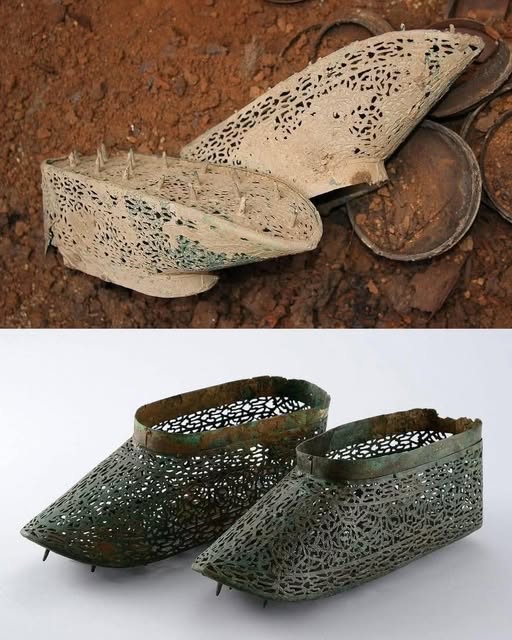 Made from thin bronze sheets and decorated with intricate perforated patterns, these shoes were ceremonial — crafted not for walking, but to guide elite souls into the afterlife. Over centuries, they were crushed and corroded, nearly erased by time.