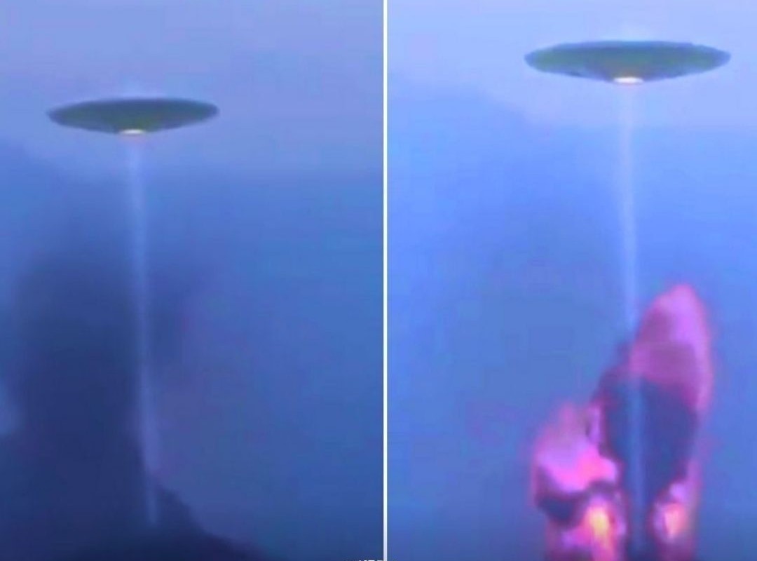 Meanwhile, footage circulating online appears to show a mysterious object hovering above an active volcano, emitting what looks like a focused beam of energy into the crater.