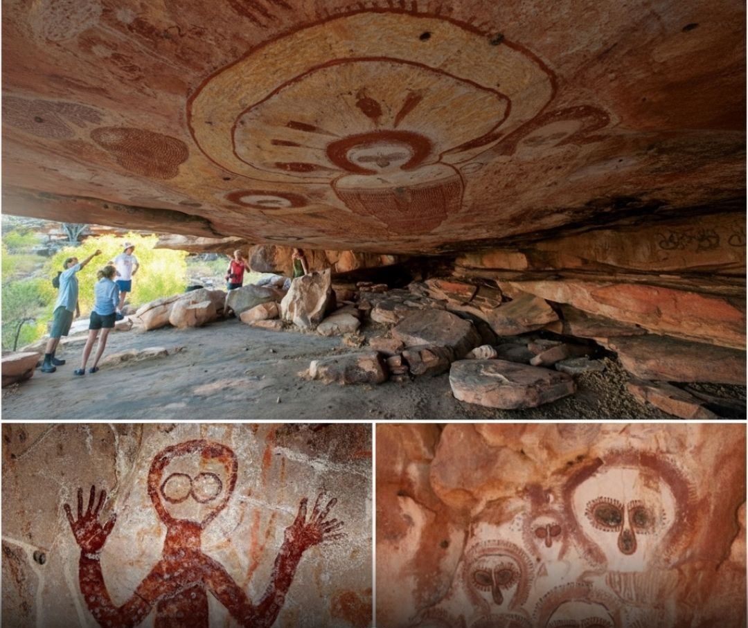 These striking figures — with large circular heads, wide eyes, and halo-like outlines — were painted by Indigenous communities thousands of years ago.