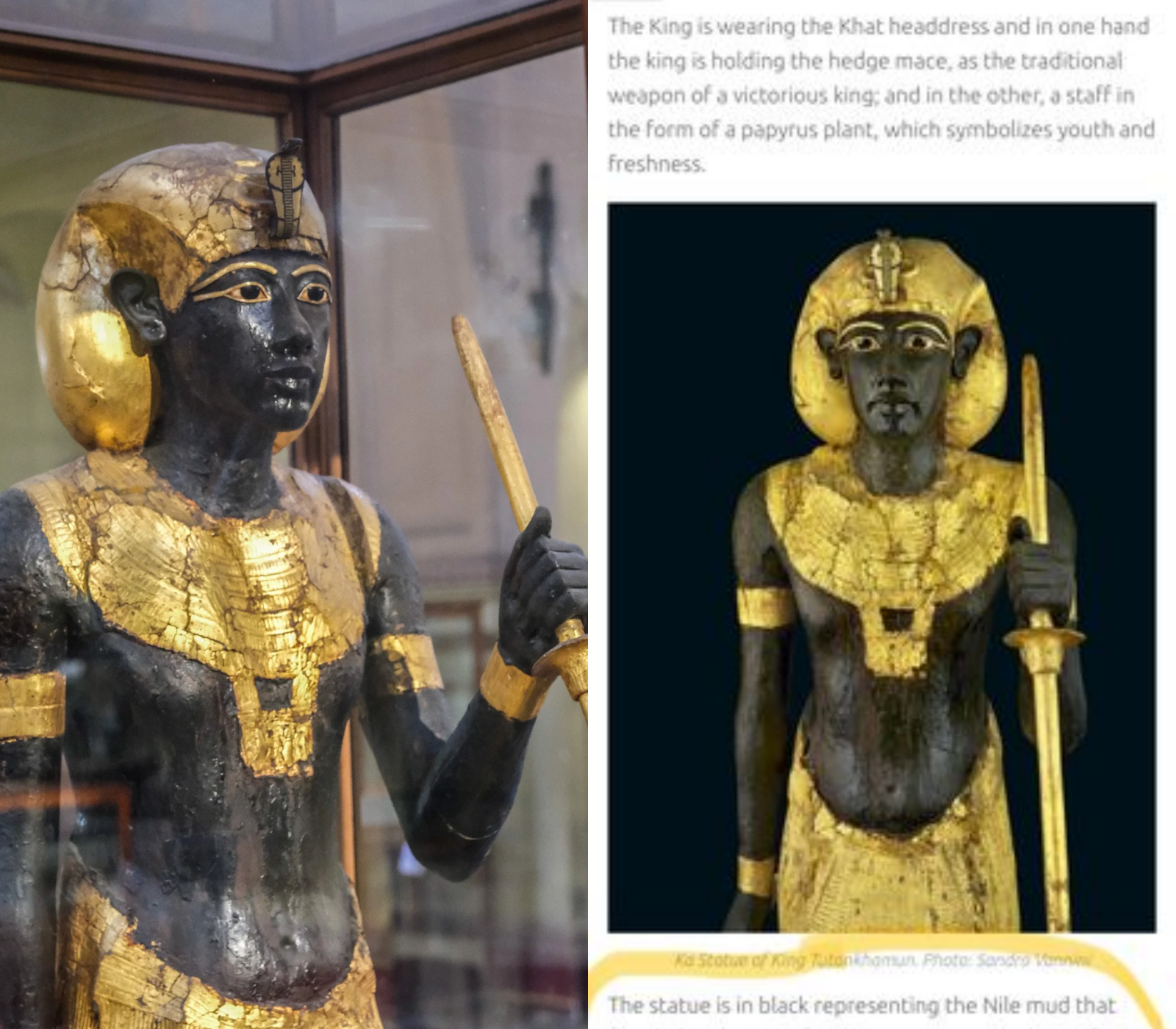These statues were crafted from wood and coated with dark resin, creating a striking black surface symbolizing rebirth and regeneration. Their garments shimmered with gold: sandals, bracelets, a broad ceremonial chest piece, and a royal kilt. In his hand, the king holds a long protective staff.