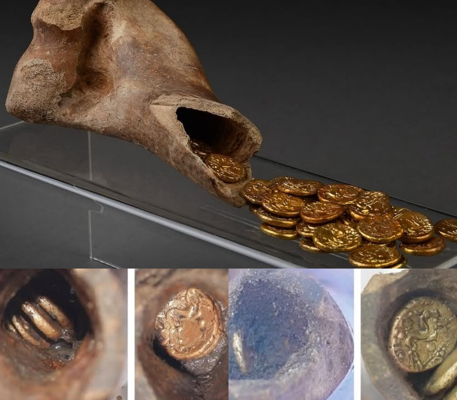 What made the discovery truly unusual was the hiding place: the coins were carefully concealed inside the hollow end of a cow’s leg bone. The bone acted as a natural container, protecting the treasure for more than two thousand years.