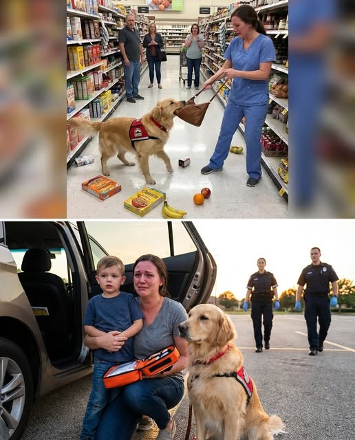 A Golden Retriever suddenly lunged forward, ripping a woman’s handbag open as groceries exploded across the aisle. People gasped. Someone shouted. Phones shot up into the air.