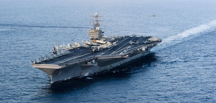 The U.S. Navy aircraft carrier USS Abraham Lincoln, part of a powerful carrier strike group, has been operating in the Arabian Sea and near the Strait of Hormuz during the ongoing crisis. The deployment is part of a broader U.S. military buildup aimed at deterring Iranian attacks and protecting international shipping lanes.