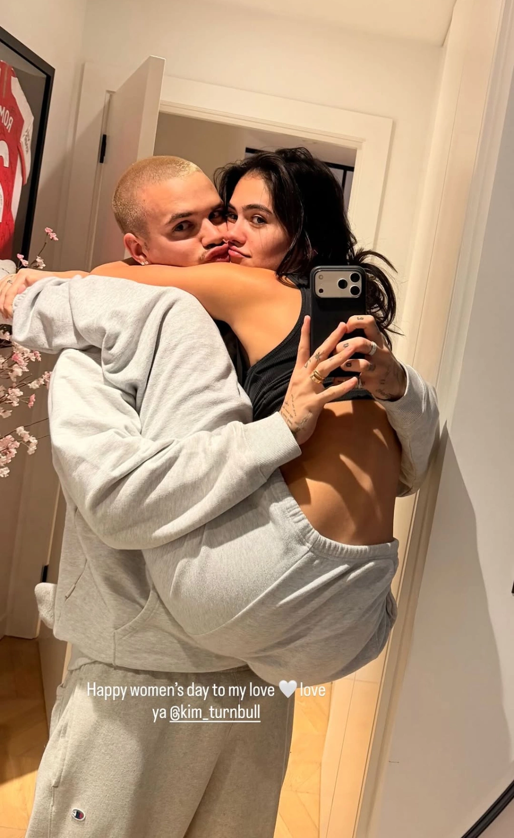 The second son of David Beckham and Victoria Beckham was seen kissing the 24-year-old DJ while lifting her into the air. The couple looked affectionate and coordinated in their grey sportswear. They took a selfie in front of a mirror in Romeo’s apartment, captioned: “Happy Women’s Day to my love. Love you, Kim Turnbull.”