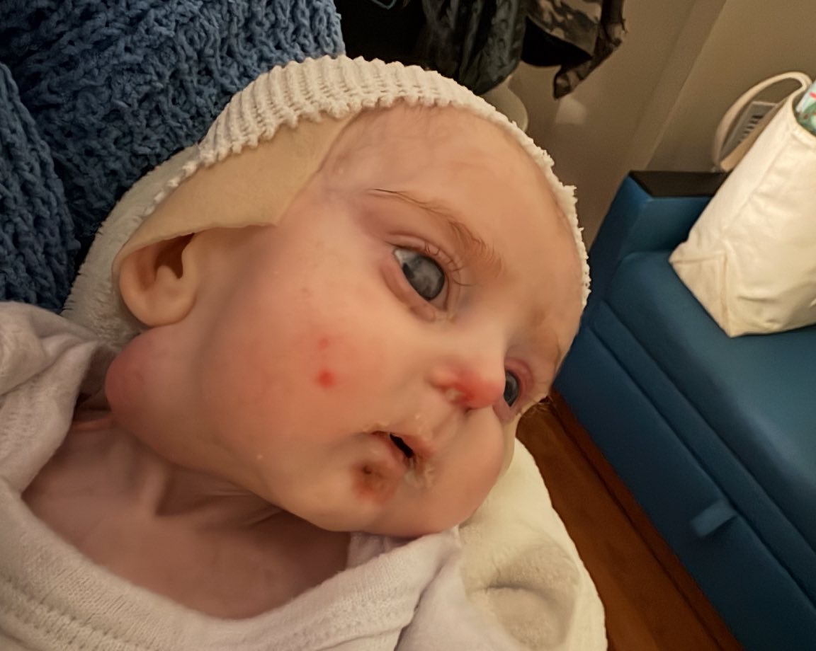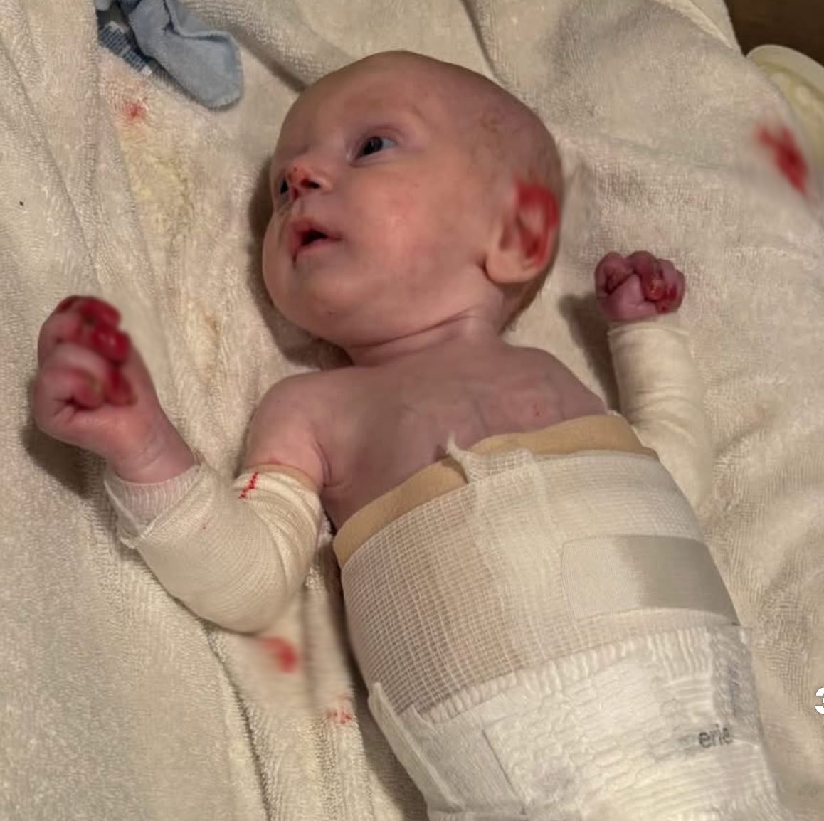 Several times each day, Ridge’s mother, Annsley, and his father, Bailey, gently change the bandages that protect his skin. The process involves applying Vaseline to the blisters and wrapping them carefully with gauze and cloth to help reduce friction and protect his delicate skin.