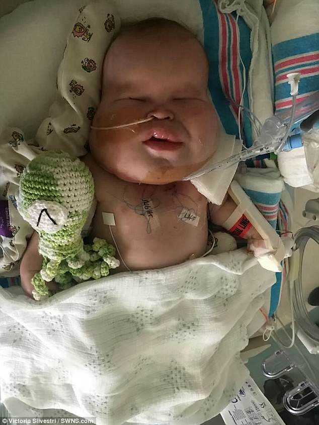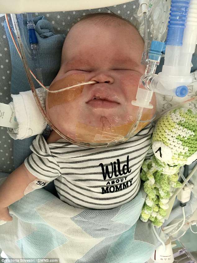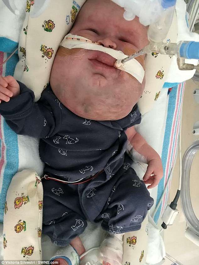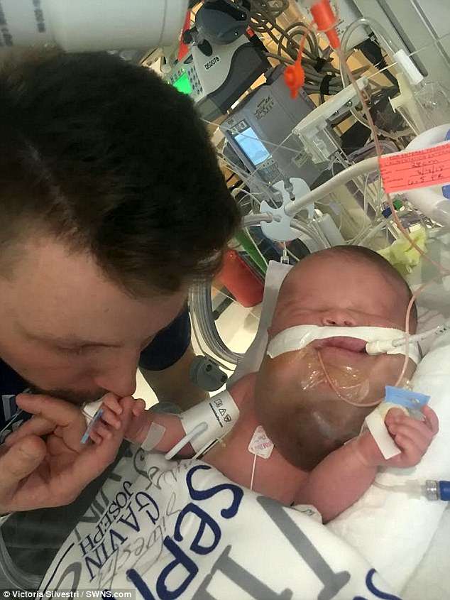 Victoria Silvestri, 27, discovered her son Gavin, now three months, suffered from cystic hygroma, which has left him with fluid-filled lumps in his cheeks, chin, lips and neck, during a scan when she was 18 weeks pregnant.