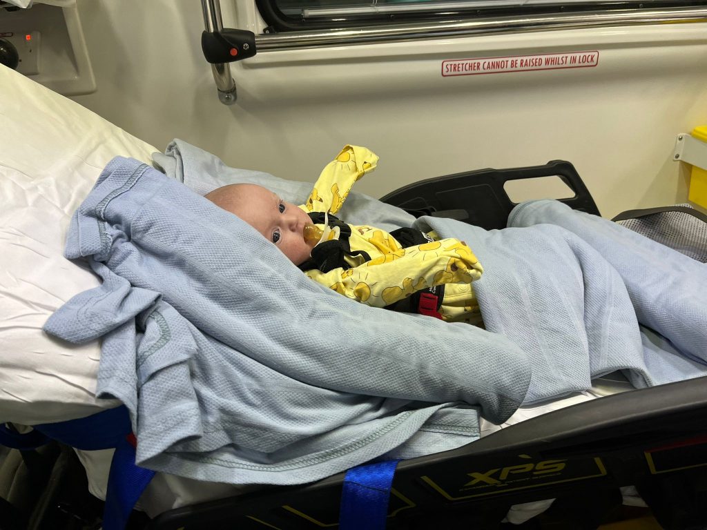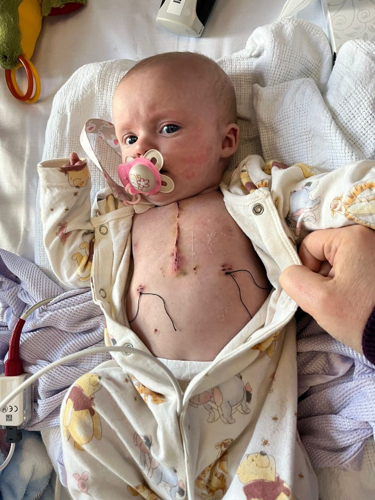 At around six-weeks old, Iris began routine oxygen saturation monitoring with community nurses. At the first visit, her oxygen levels were very low, and this resulted in us being blue-lighted to hospital and Iris starting medication. We were completely shocked, as we were told she was unlikely to have problems before surgery, and to look out for her turning blue, but there was no colour change.