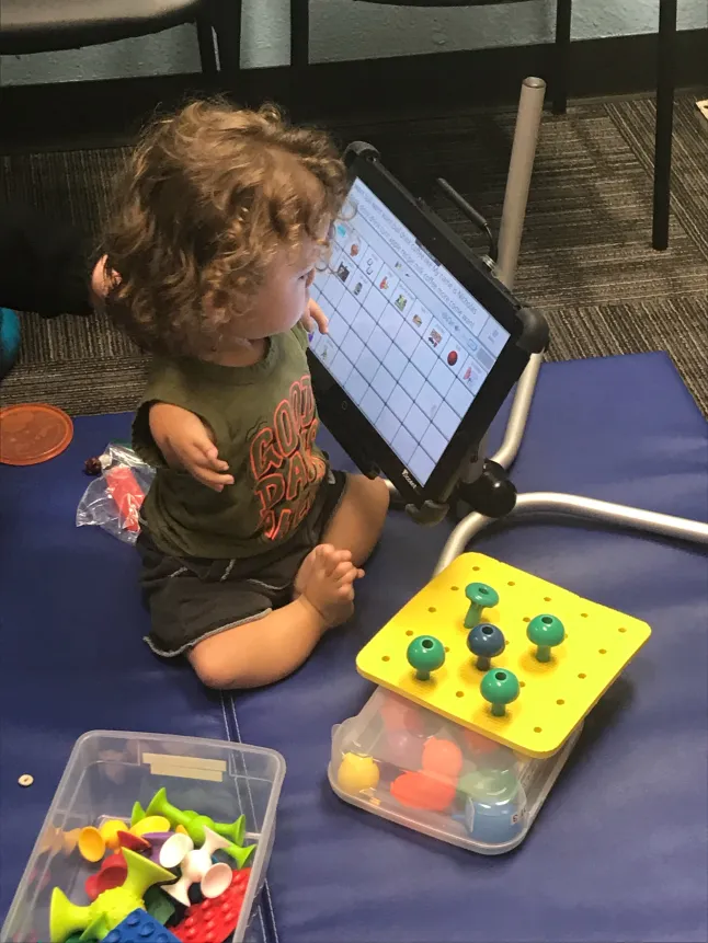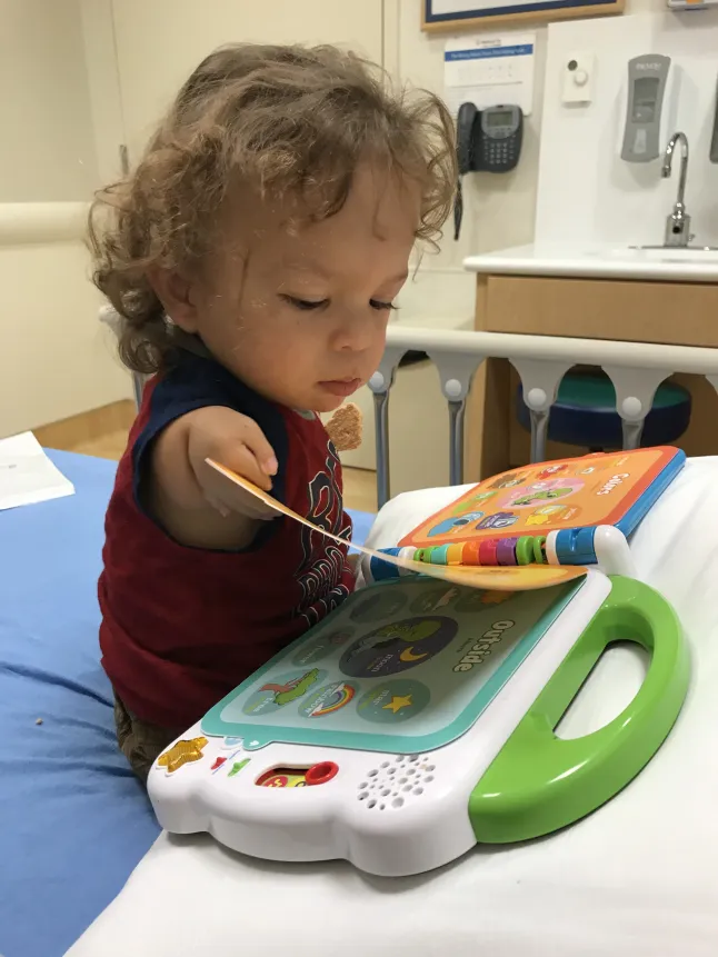 As well as learning how to shuffle about and feed himself, Nicolas also has a touch-screen tablet which lets him play and watch TV.
