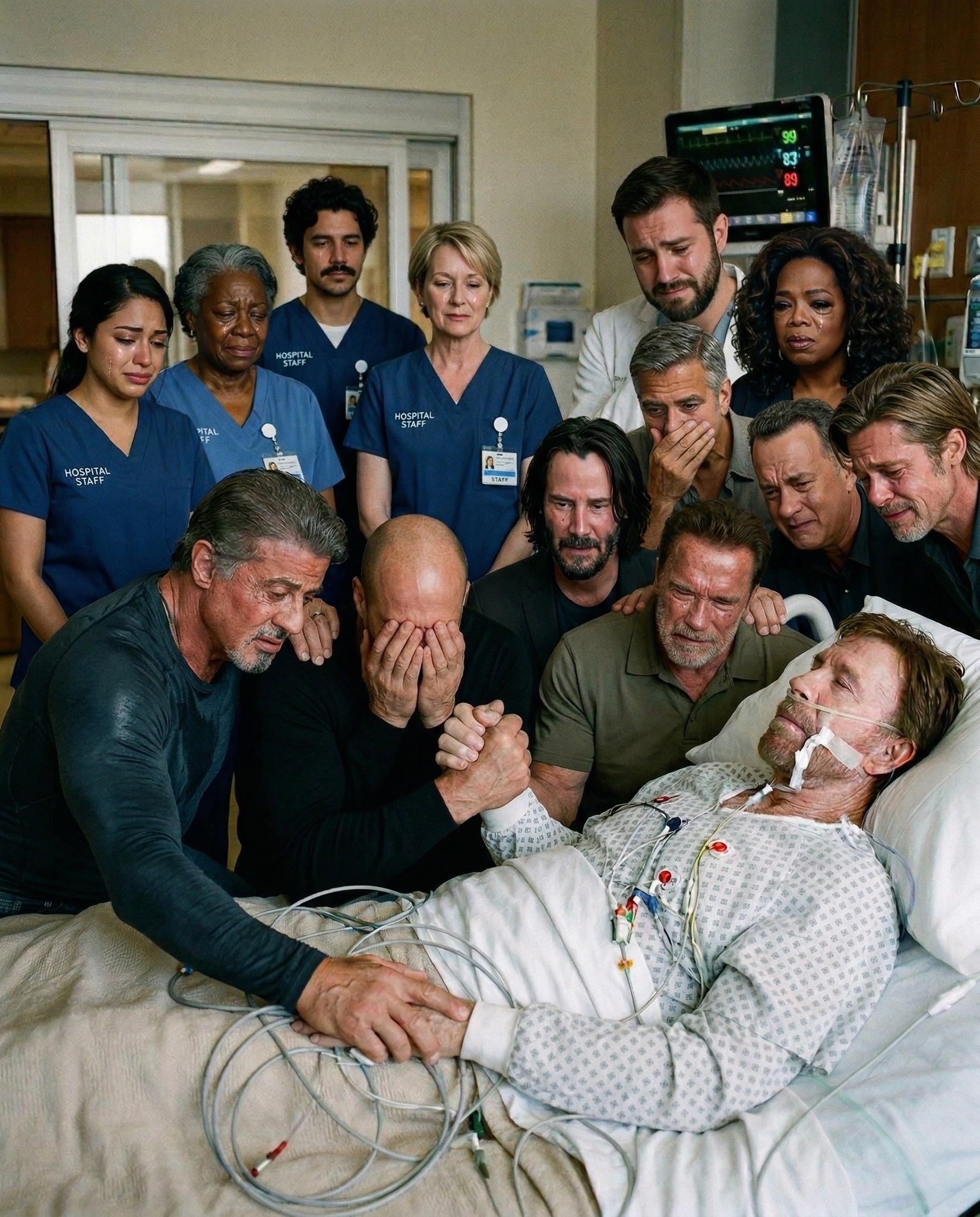 Today, that world feels different. In a moment too heavy for any script to capture, the greatest icons of cinema—Sylvester Stallone, Arnold Schwarzenegger, Keanu Reeves, Jason Statham, Tom Hanks, George Clooney, Brad Pitt, and Oprah Winfrey—stand not as legends, but as brothers and friends, gathered beside the man who once seemed untouchable: Chuck Norris.
