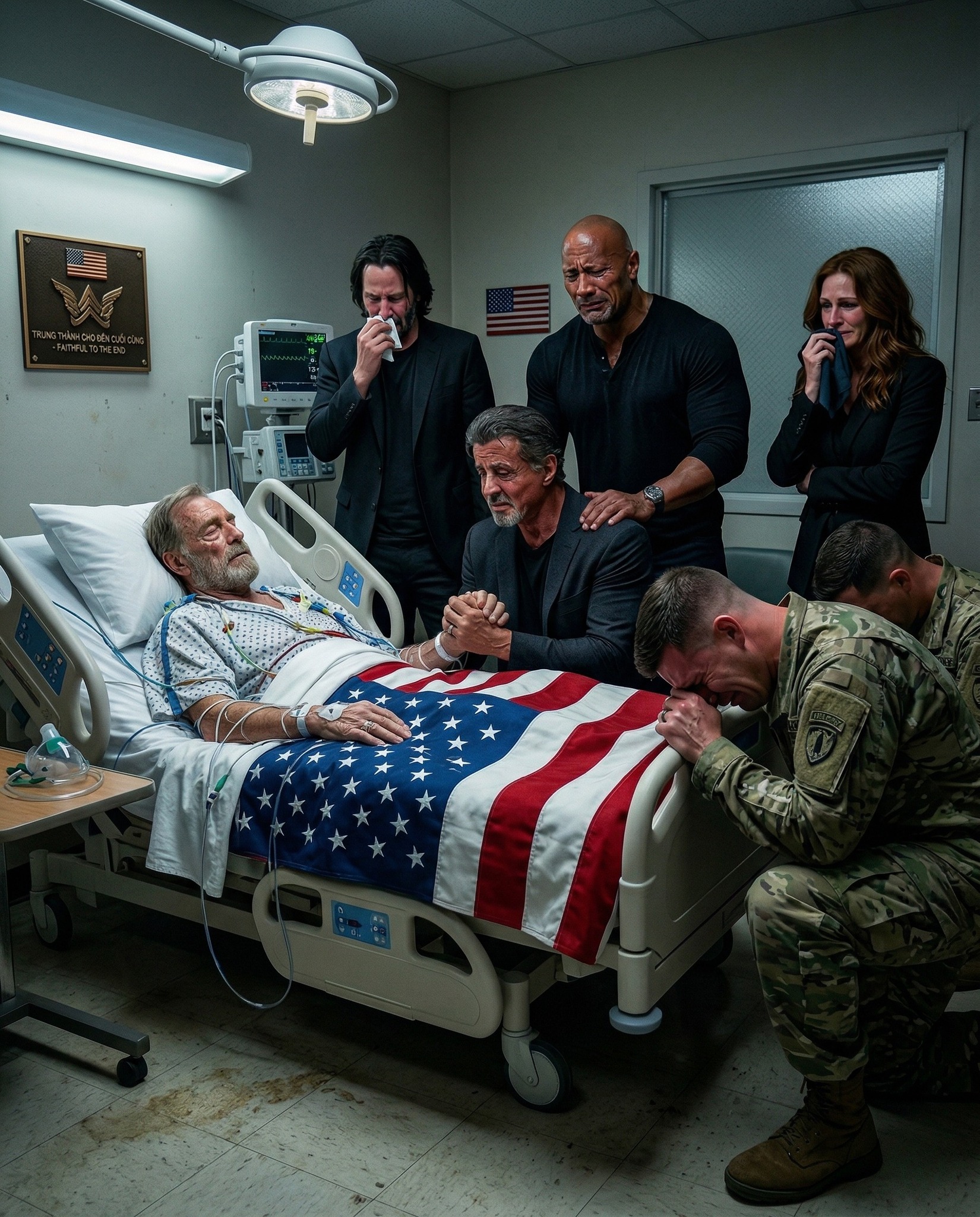 In a quiet room filled with unspoken emotion, Sylvester Stallone kneels beside the bed, his head lowered in a moment that feels heavier than any scene he has ever performed. Nearby, Dwayne Johnson stands in silence, his presence powerful yet shaken. Keanu Reeves, known for his calm strength, cannot hide the weight in his eyes. Even Julia Roberts, whose smile once lit up countless screens, now reflects a quiet grief that words cannot carry.