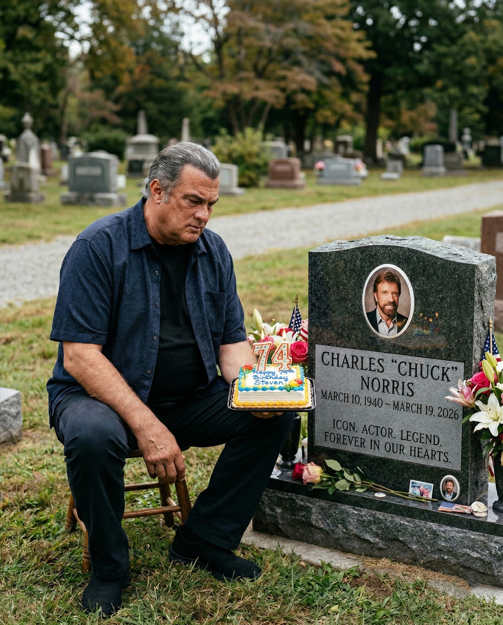 On his 74th birthday, Steven Seagal drove to the grave of Chuck Norris, sat down in a wooden chair, and held a birthday cake that said both their names — because the only celebration that made sense was the one shared with the man who understood him best