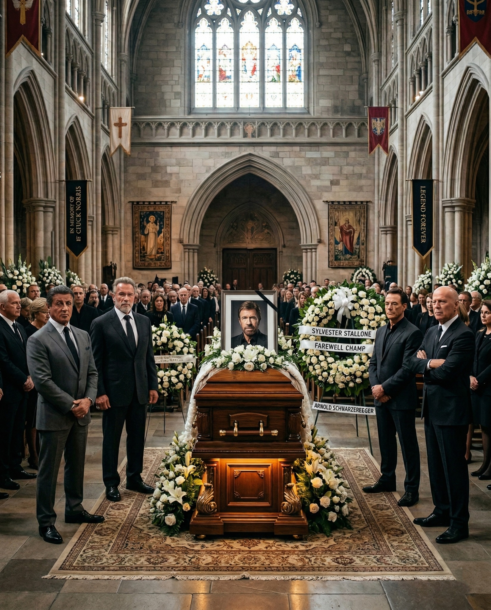 Not the silence of emptiness — the silence of too much feeling compressed into too small a space, of hundreds of people breathing carefully, of grief so collective and so genuine that it becomes its own kind of presence in the room. White flowers everywhere. White lilies, white roses, white chrysanthemums — the color of farewell chosen by people who wanted this to be beautiful, because he deserved beautiful, because Carlos Ray Norris deserved every last petal.