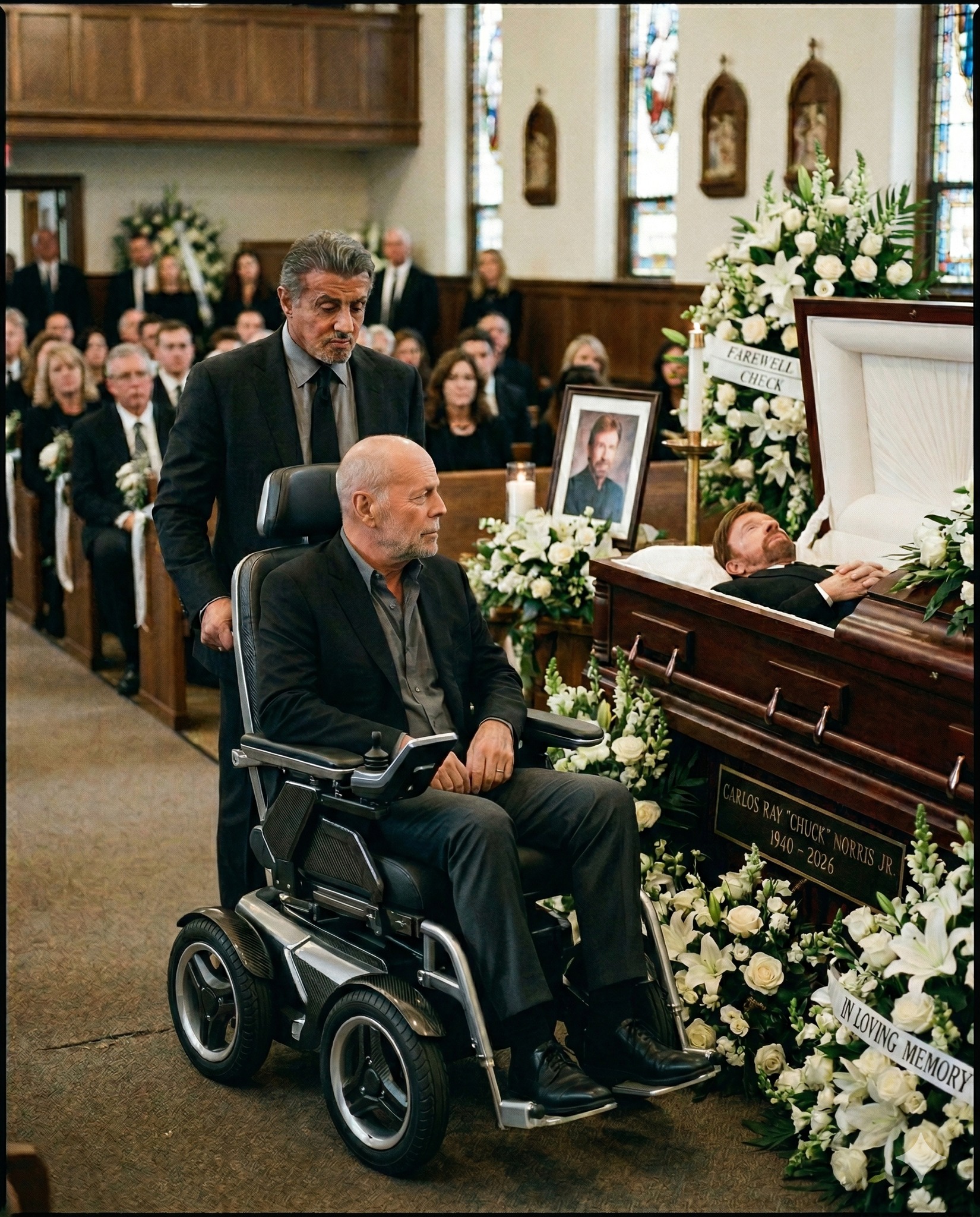 That is the reality that no ceremony, no matter how carefully constructed, can soften. The flowers can be white and abundant. The casket can be polished to a mirror finish. The portrait can capture him perfectly — and it does, Chuck Norris in his white gi looking out with that expression of complete, warm, unshakeable dignity, the words beneath him reading simply With Deep Respect as if the portrait itself is bowing.