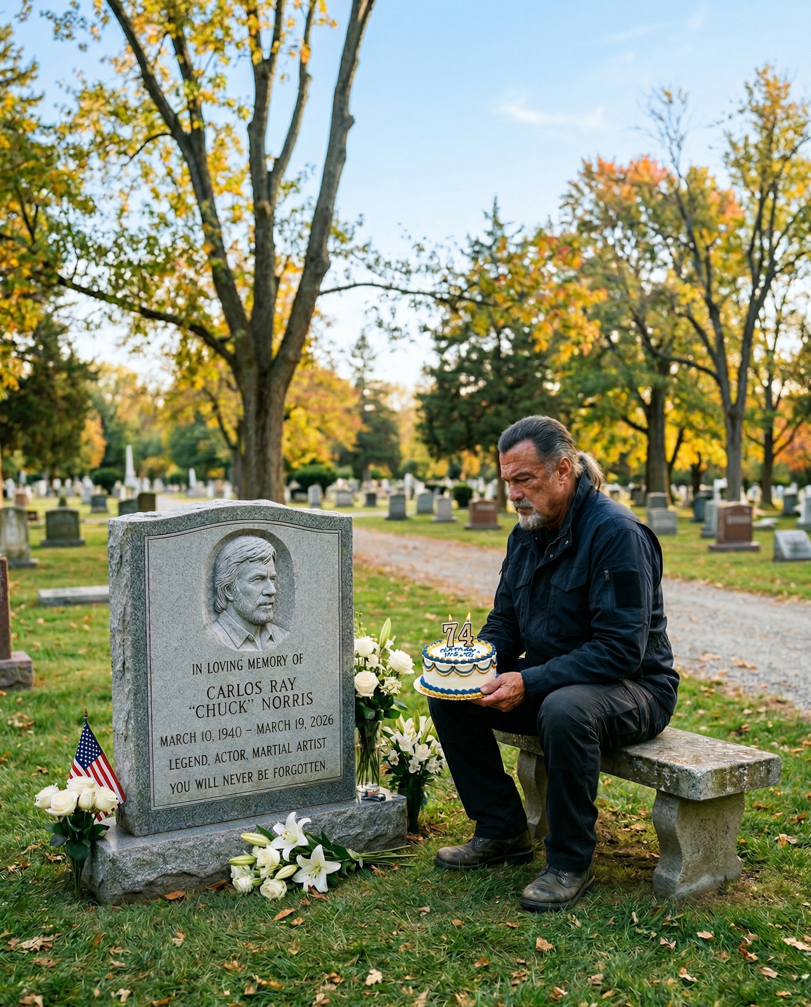 Some moments are too honest for singing. Too raw for the cheerful ritual that birthdays usually demand. He simply sits. Holds the cake. Looks at the portrait carved into the stone — Chuck Norris as the world knew him, as Seagal knew him, captured in the permanent democracy of granite.
