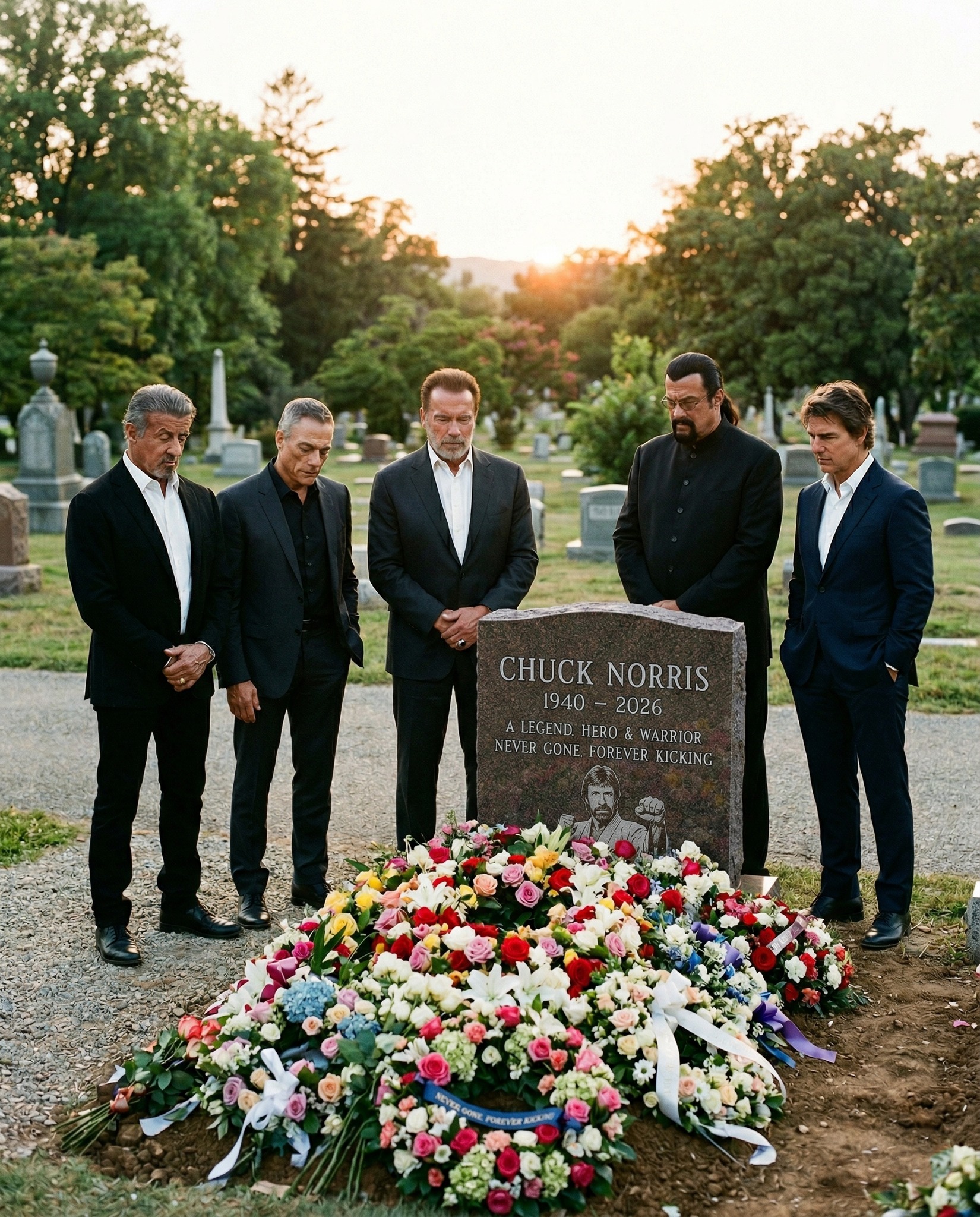 After the funeral ended and the world went home — five legends remained standing at the grave of Chuck Norris, and the setting sun witnessed what cameras were never meant to capture