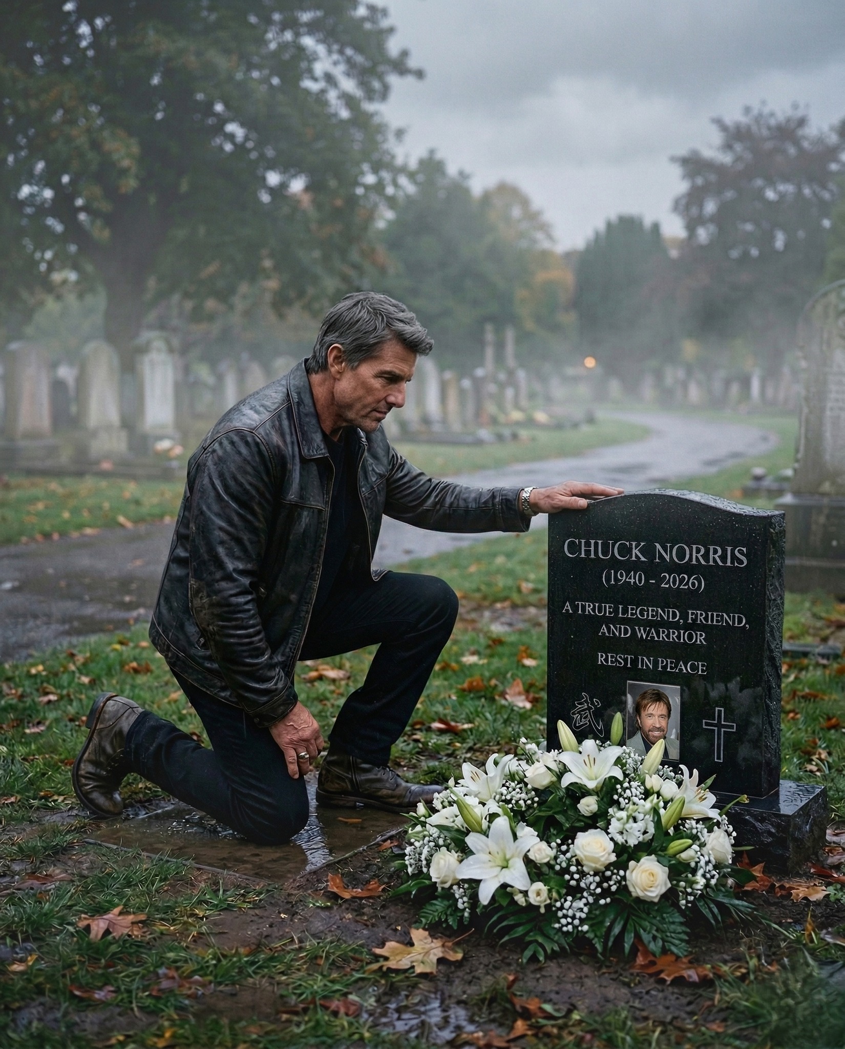 And Tom Cruise, standing alone beside a portrait in a cemetery, dressed in black, hands clasped, face carrying the particular stillness of a man who has not yet fully processed what he is looking at — this photograph is the world’s grief made visible. One legend, standing at the threshold of another legend’s departure. One man who has spent his entire career refusing to accept the limits of the physically possible, paying his respects to the man who defined that refusal for an entire generation before him.