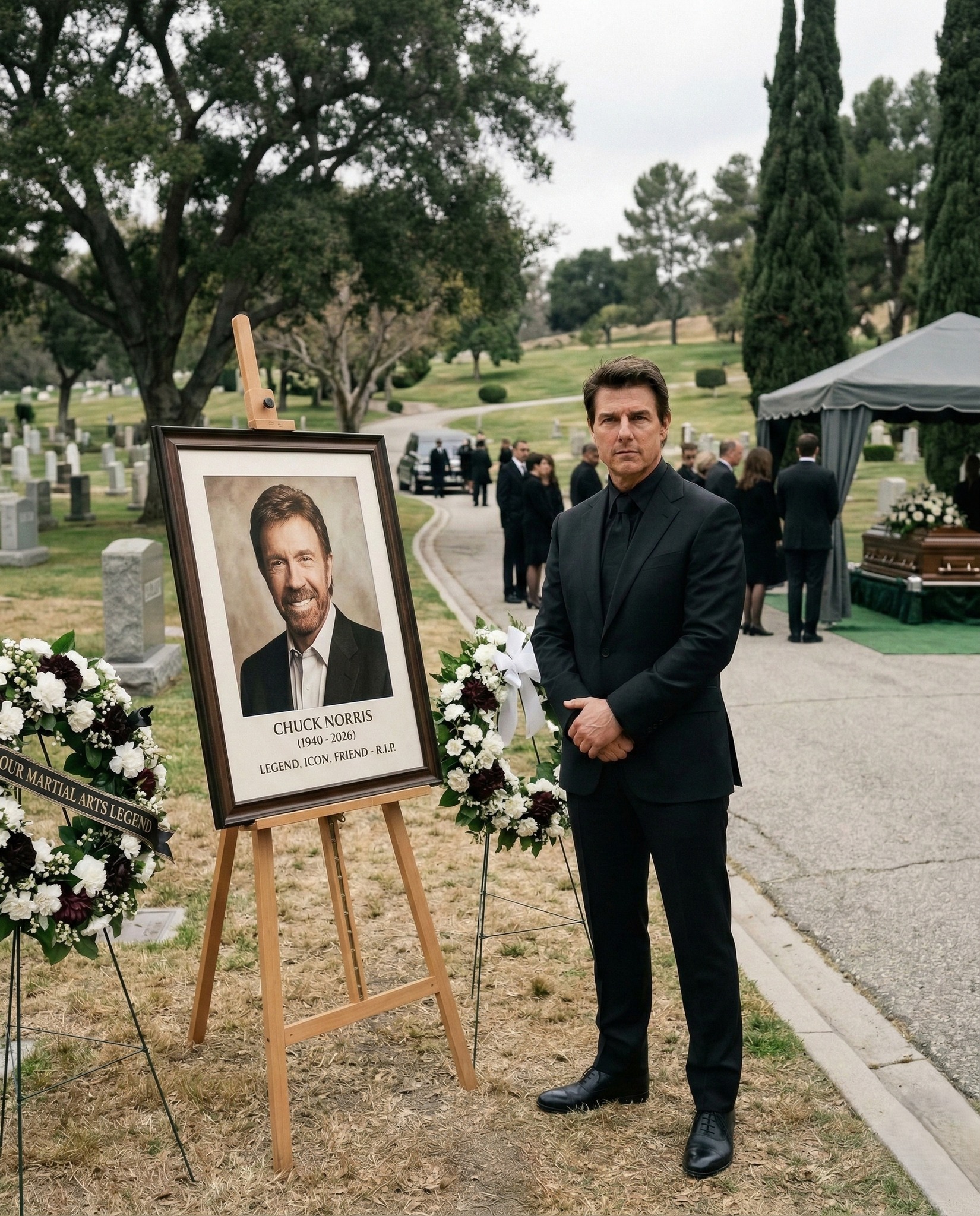 Tom Cruise knows this. He is standing in a cemetery in black, hands clasped, face still, bearing witness to an ending that is also a permanence. The body in the casket. The legend on the portrait. And between them, the vast, irreducible evidence of a life that happened fully and left the world permanently different for having happened.