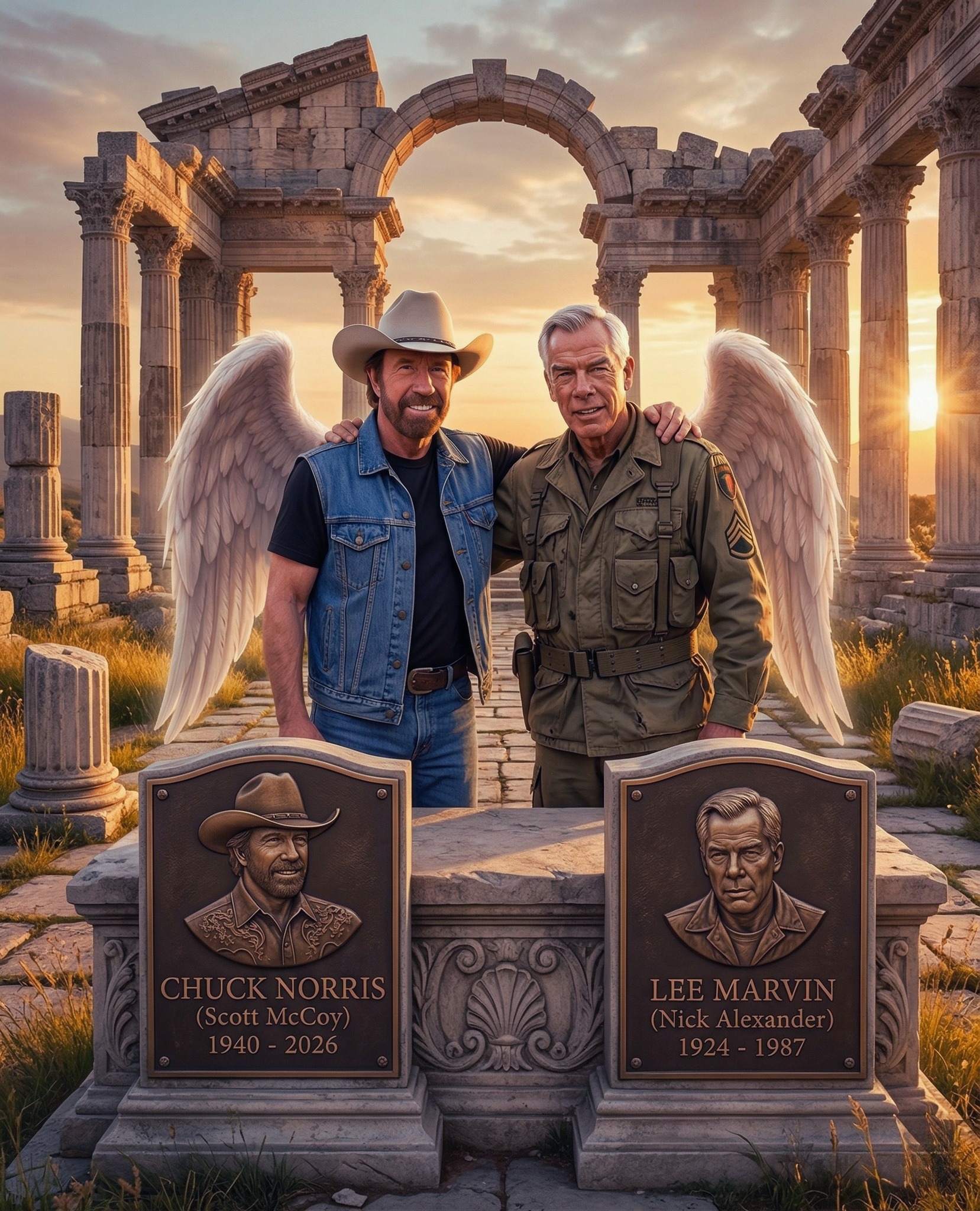 THE COMMANDERS COALESCE Chuck Norris and Lee Marvin stand shoulder-to-shoulder, their wings outspread as a symbol of the peace they’ve finally earned. This isn’t just a meeting of actors; it is the reunion of Major Scott McCoy and Colonel Nick Alexander.