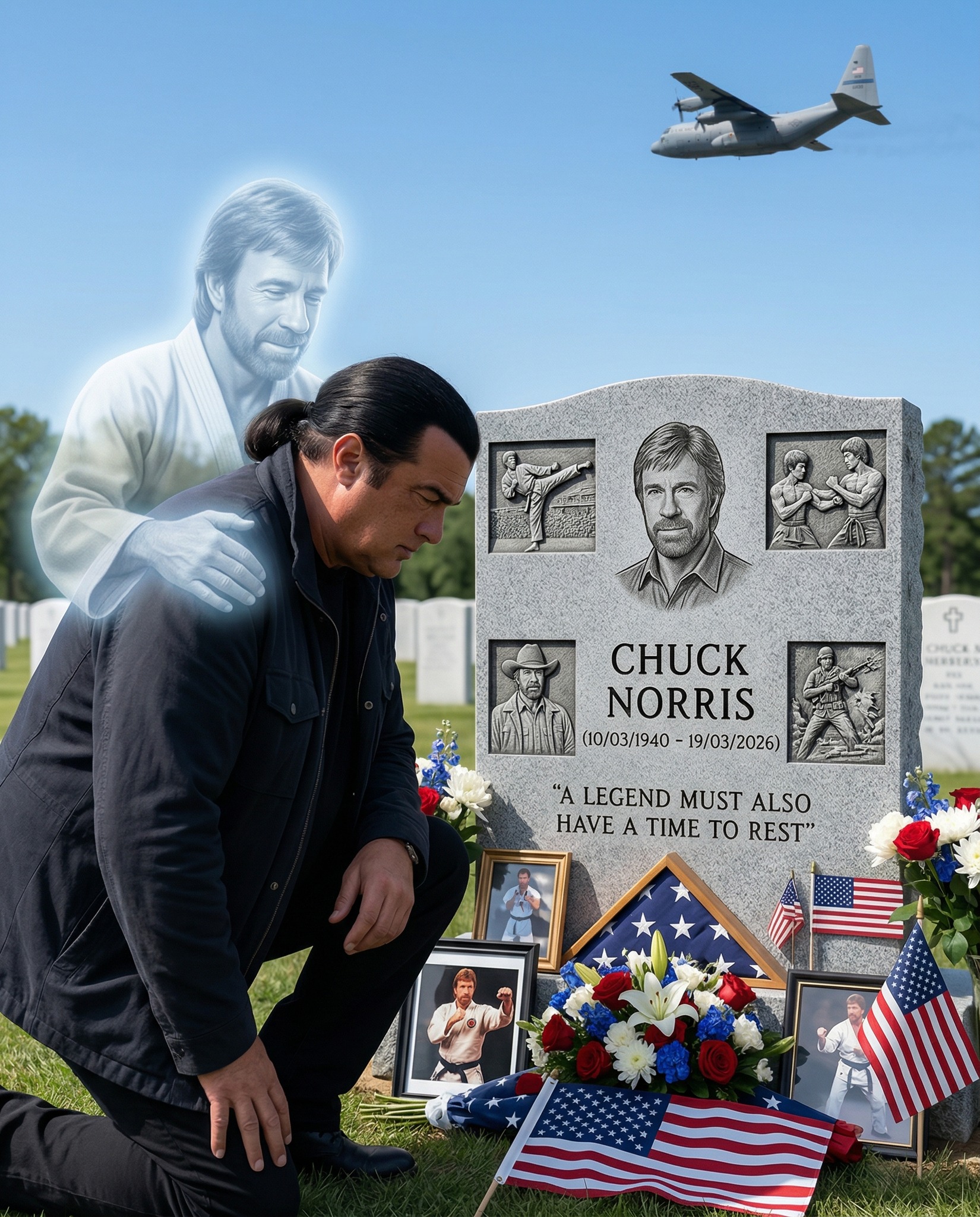 Beneath a calm blue sky, where the distant hum of an aircraft fades into the horizon, a quiet and deeply emotional moment unfolds before the grave of Chuck Norris. The air feels still, almost sacred, as if time itself pauses to honor a man whose legacy shaped generations. Kneeling in front of the headstone is Steven Seagal, his head bowed, his posture heavy with grief and reflection.