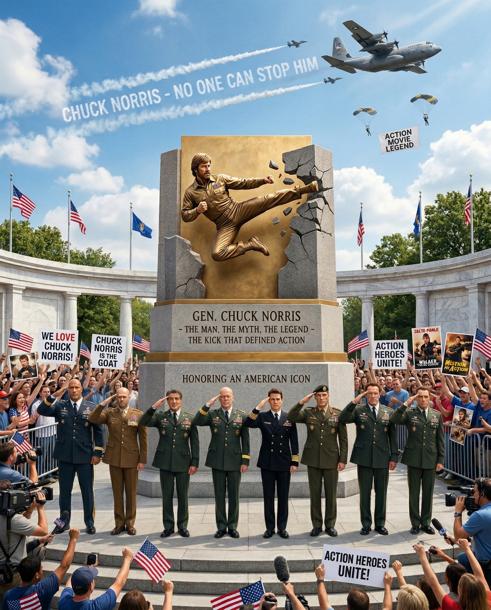 Beneath a bright sky painted with the colors of freedom, a solemn yet powerful moment unfolds in front of a grand monument dedicated to the legendary Chuck Norris. The towering golden statue captures him mid-kick—frozen in time, yet alive in memory—symbolizing not just a man, but an era of action cinema that defined generations. Around the monument, a sea of admirers gathers, waving flags and holding signs that celebrate his legacy. But at the center of this emotional tribute stand some of the greatest action stars of all time, united in respect.