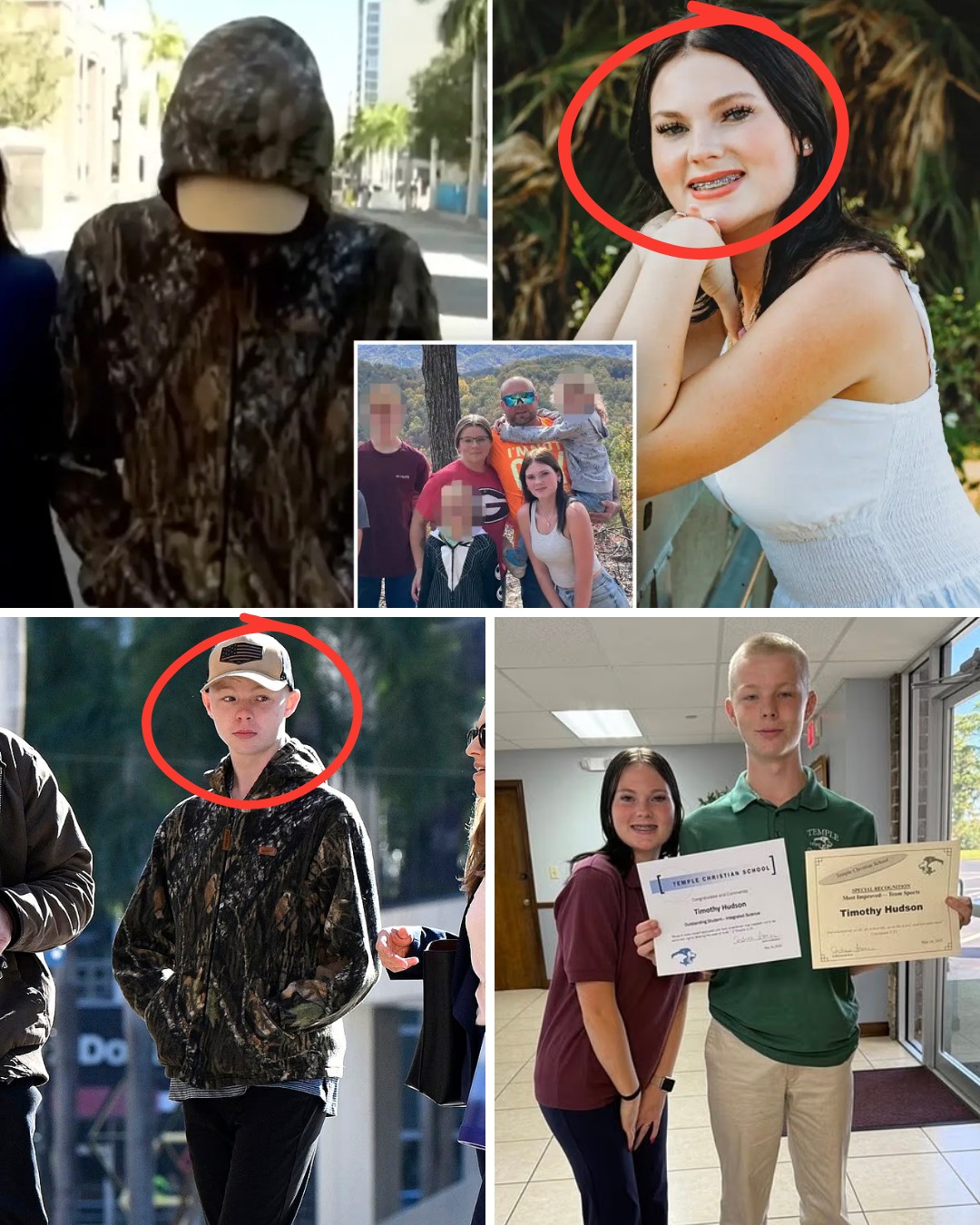The 16-year-old stepbrother of Anna Kepner is (seen arriving in federal court in February) has been unmasked as Timothy Hudson after being charged as an adult in her murder