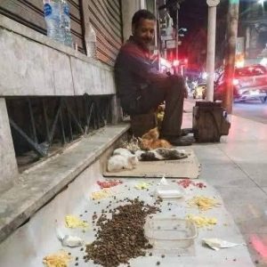 The way he presents the food—”carefully laid out… as if he’s presenting them a feast”—is the most moving part of this story. When someone has nothing, the only thing they truly “own” is their intention. By refusing to just toss scraps on the ground and instead creating a clean, organized space for them to eat, he is treating these animals as guests of honor. He is giving them something the world rarely gives him: respect.