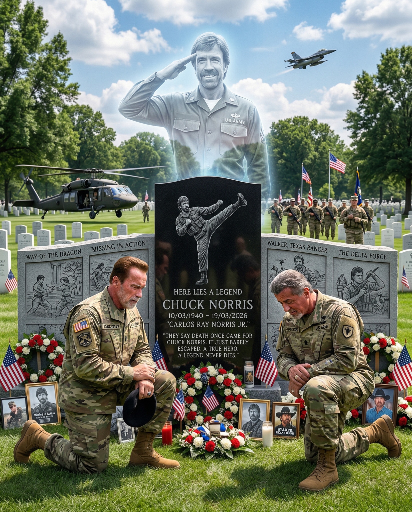 Beneath a quiet sky where the wind moves gently through rows of white headstones, the world feels slower, heavier—as if time itself pauses out of respect. In the heart of this solemn place lies the grave of Chuck Norris, a man whose name became synonymous with strength, honor, and unbreakable will. Today, the silence carries more than grief; it carries remembrance, admiration, and a deep sense of gratitude for a life that shaped generations.