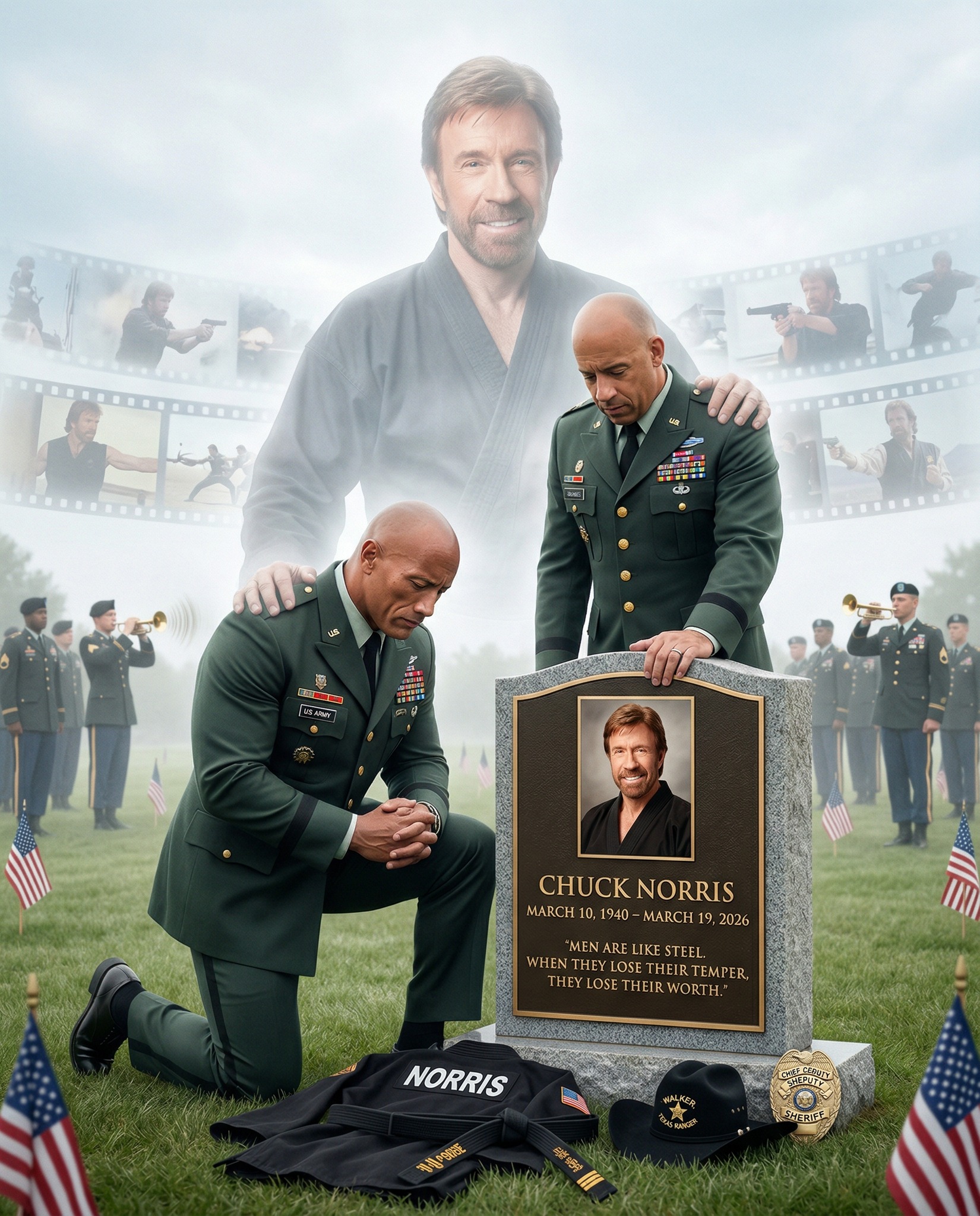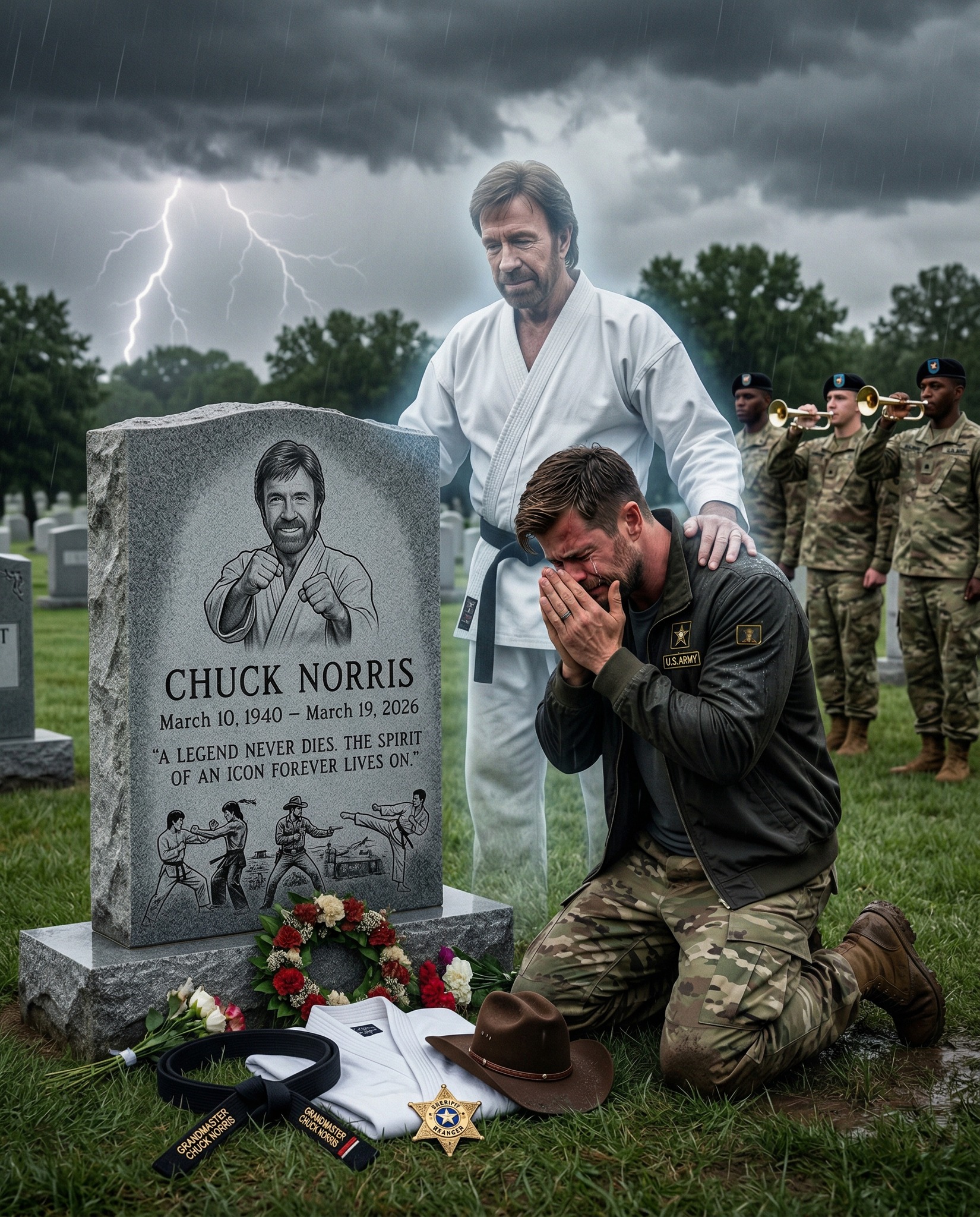 At the base of the gravestone lie symbols of his legacy—a martial arts uniform, carefully folded; a black belt representing mastery and discipline; a cowboy hat recalling his iconic role as a protector; and a badge symbolizing justice. These are not just objects.