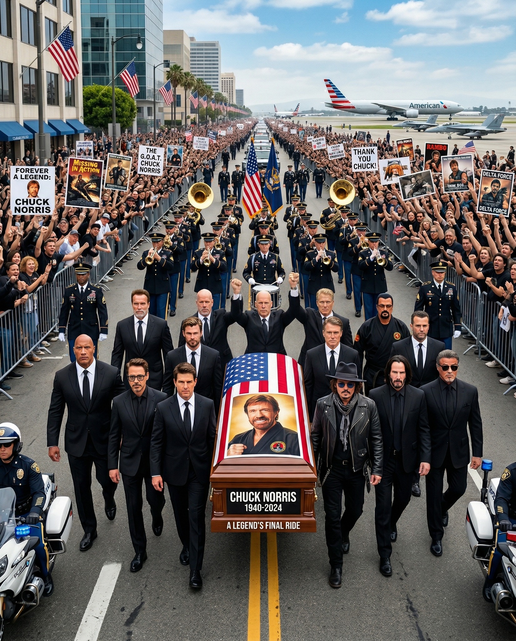 On both sides of the street, thousands of fans stand behind barriers, their faces filled with emotion. Some hold signs reading *“Forever a Legend”* and *“Thank You, Chuck!”* Others raise posters of his most iconic films. Many simply stand in silence, tears in their eyes, hands over their hearts.