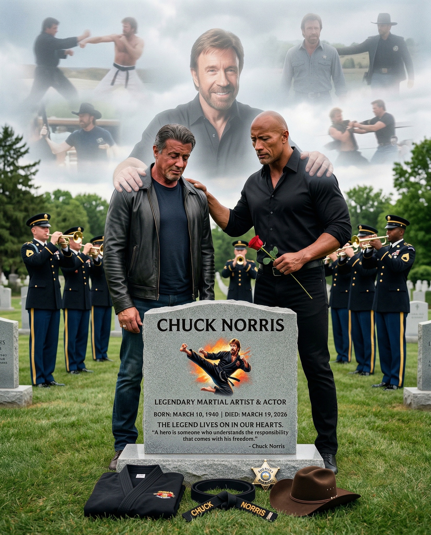 At the base of the gravestone lie deeply symbolic items—a neatly folded martial arts uniform, a black belt bearing the name “Norris,” a Texas Ranger badge, and a cowboy hat. Each object represents a different part of the legend.