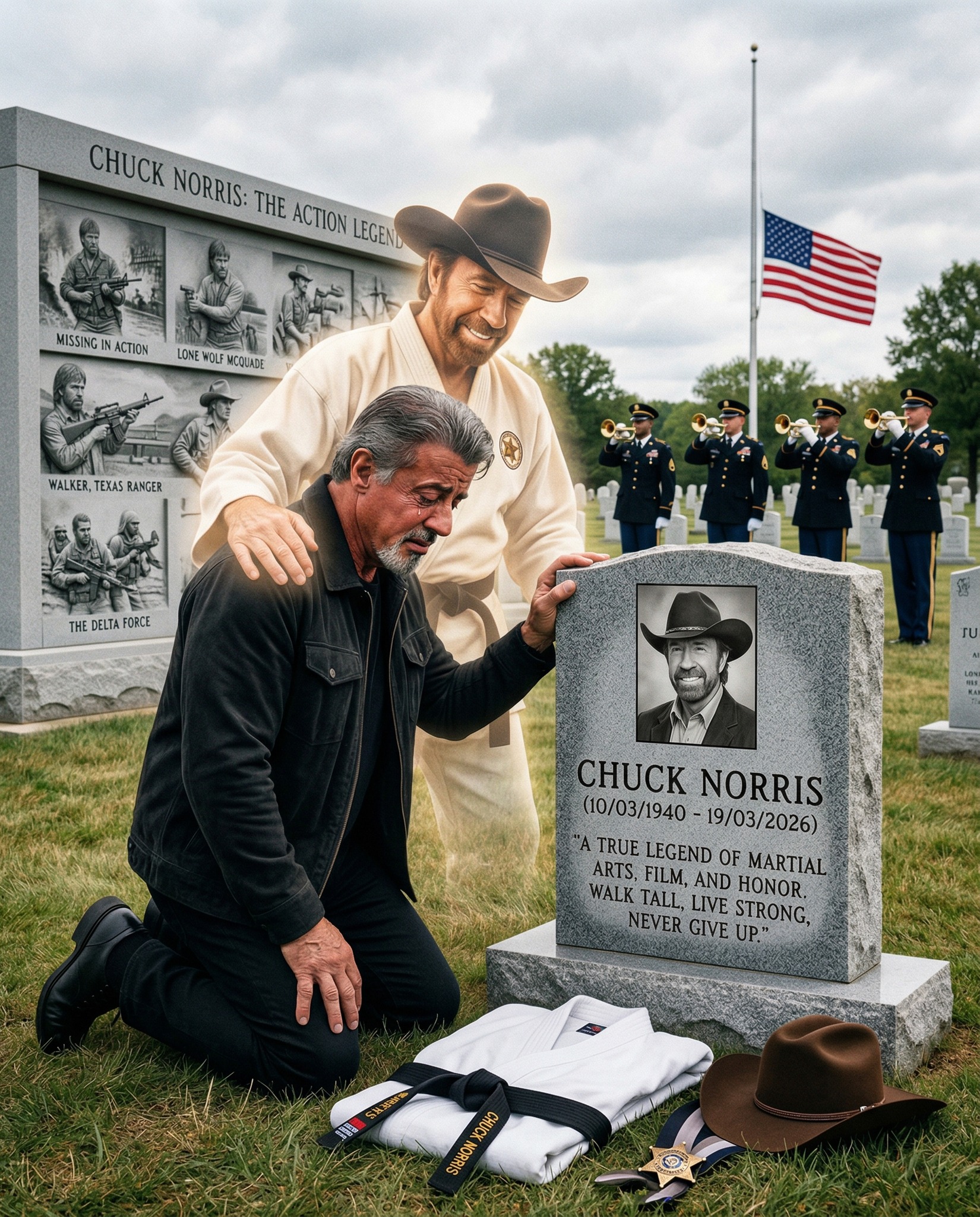 Around the gravestone lie meaningful symbols—a folded martial arts uniform, a black belt, a Texas Ranger badge, a cowboy hat. Each object tells a story.