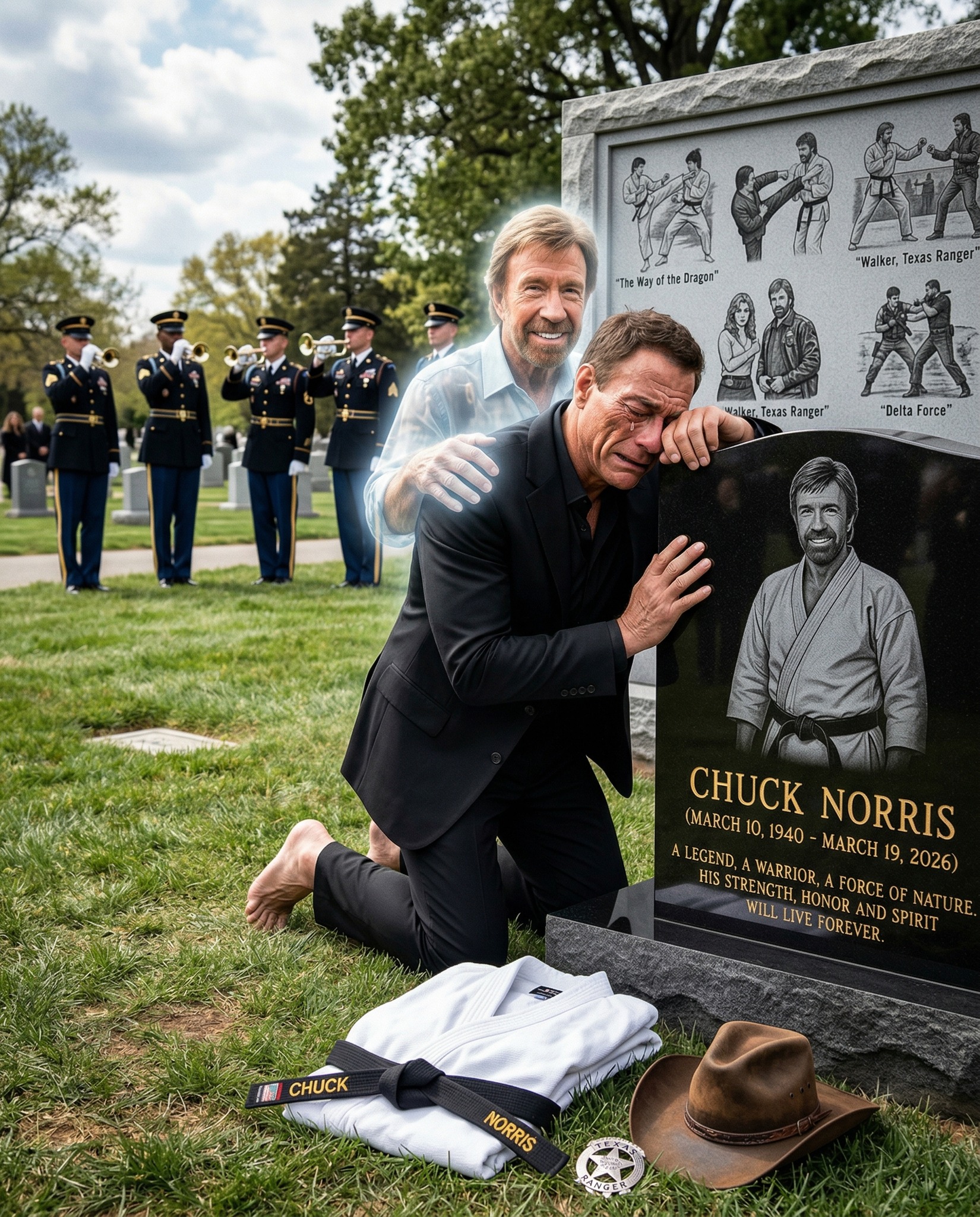 There are moments in life when words feel too small, too fragile to carry the weight of emotion. Moments when silence becomes the only language strong enough to speak. The image before us captures one of those rare, unforgettable moments—Jean-Claude Van Damme kneeling before the grave of Chuck Norris, his posture heavy with respect, his heart clearly overwhelmed by something deeper than sorrow.