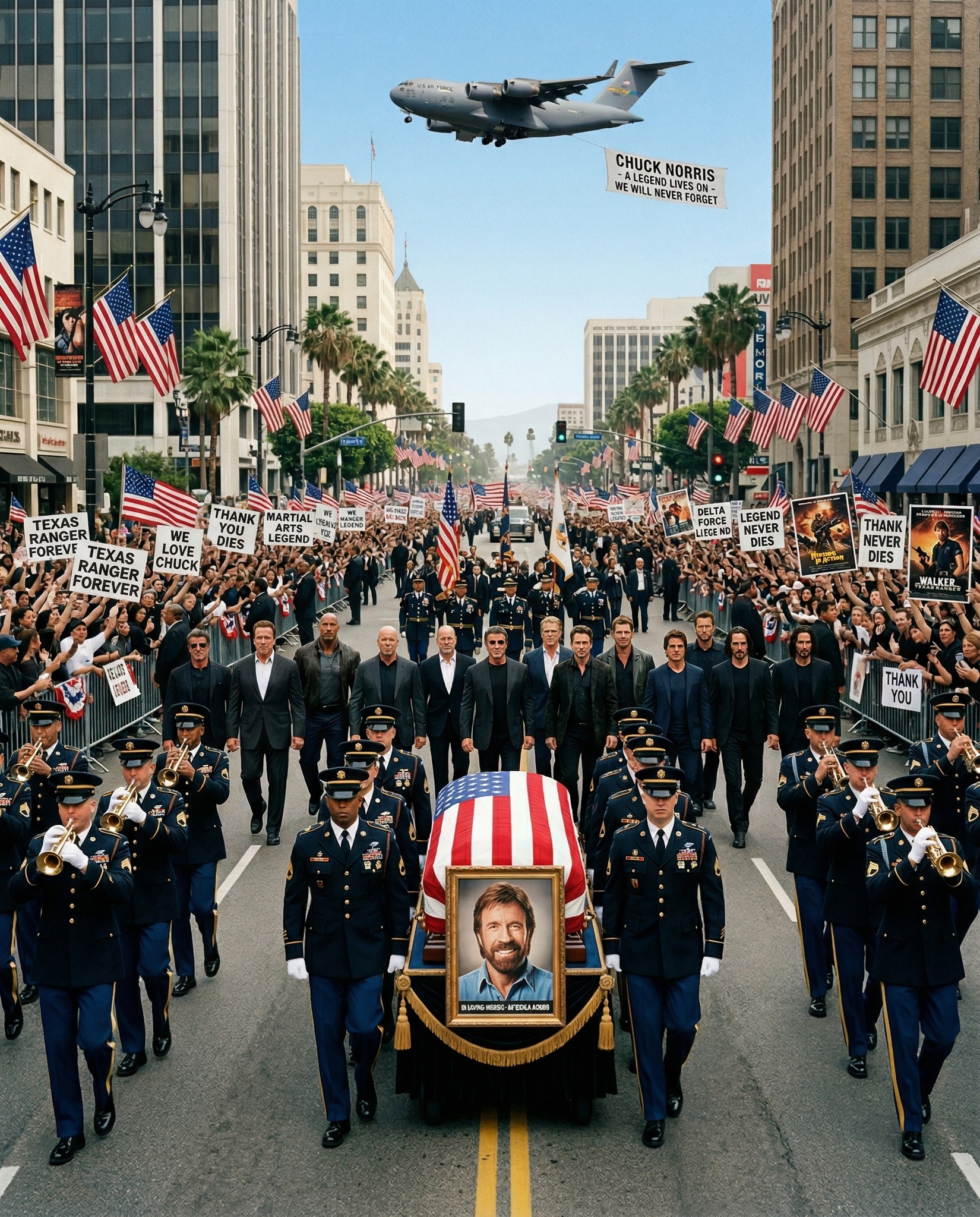 On both sides of the street, thousands of fans held signs high above their heads: “Legend Never Dies,” “Walker Lives Forever,” and “Thank You, Chuck.” Some clutched posters from his most famous works, others simply held their hands to their hearts. Tears flowed freely, yet there was also pride—a deep, unshakable pride in having witnessed the era of Chuck Norris.