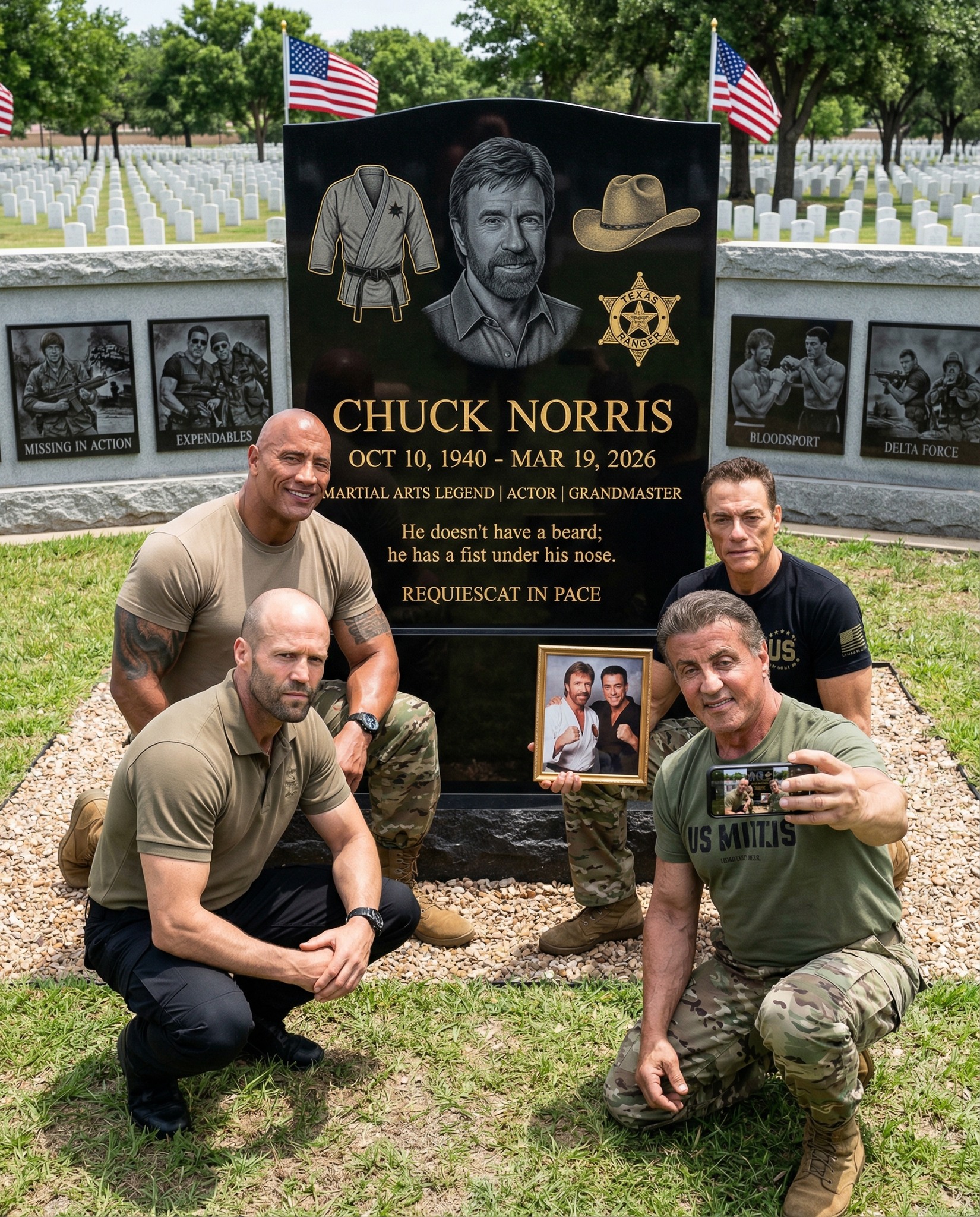 Under a bright and peaceful sky, where rows of white headstones stretched into the distance and American flags moved softly in the breeze, four legends of action cinema gathered in solemn respect before the polished black gravestone of Chuck Norris. Dwayne Johnson, Jean-Claude Van Damme, Sylvester Stallone, and Jason Statham stood together not as stars, but as brothers paying tribute to a man whose legacy helped define generations.