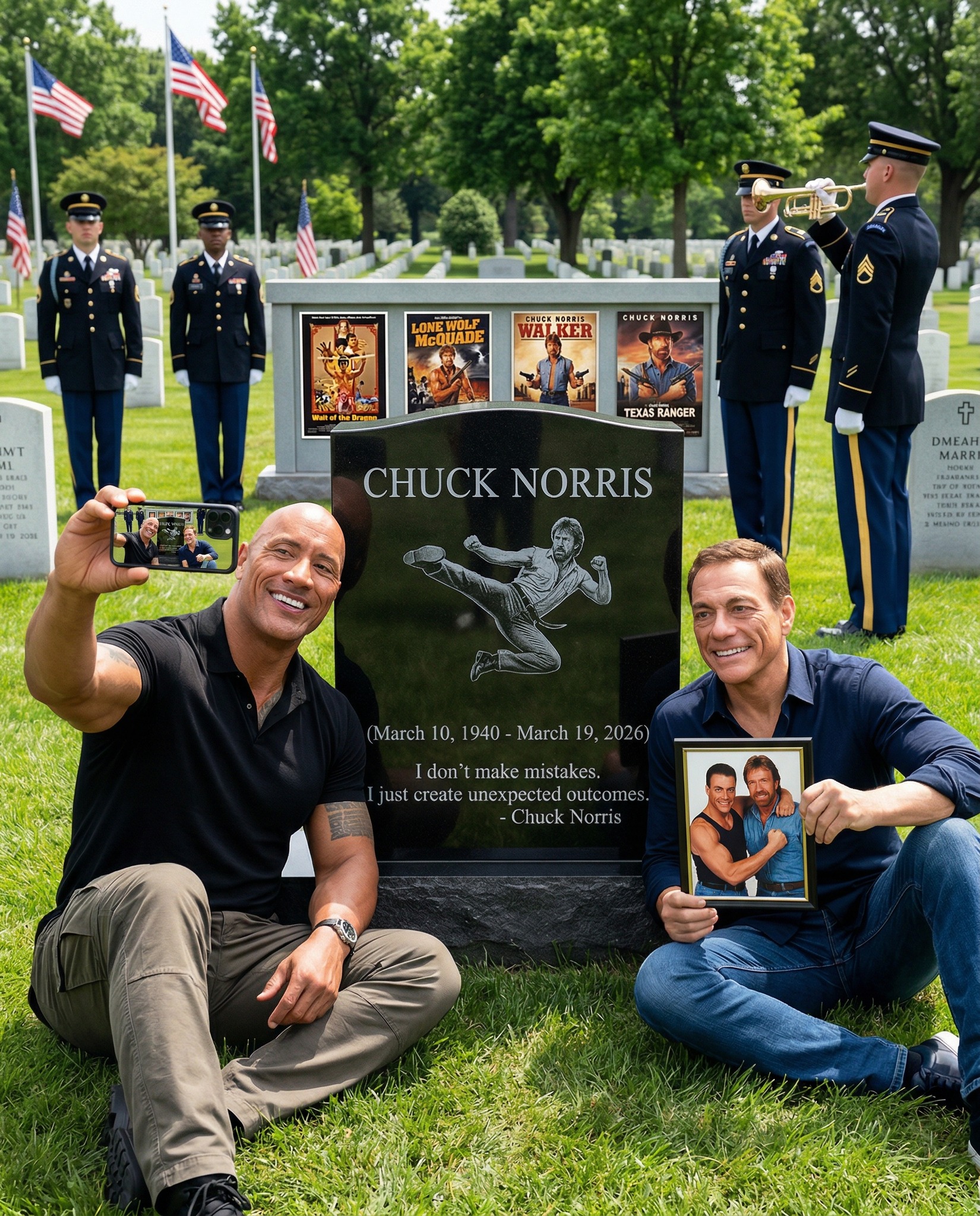 On a quiet hillside beneath a muted gray sky, history seemed to pause as some of cinema’s greatest action legends stood together in solemn tribute to Chuck Norris. There were no cameras chasing spectacle, no applause, no grand stage—only silence, remembrance, and the weight of legacy. Before a dignified memorial etched with symbols of his extraordinary life, eight men who helped define generations of action cinema gathered not as stars, but as brothers saying farewell to one of the last true icons.